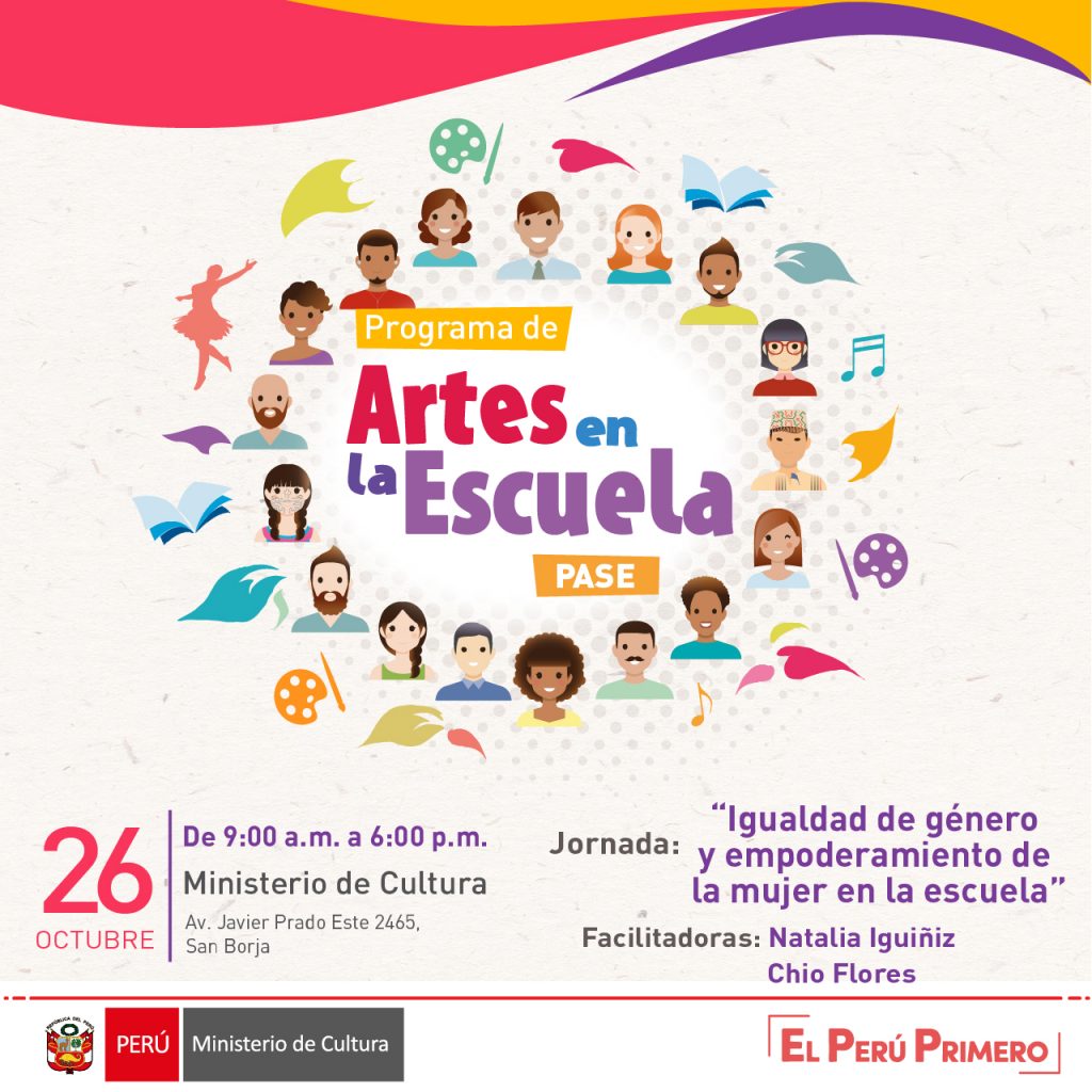 El Ministerio de Cultura, a través de la Dirección de Artes, organiza una nueva jornada de capacitación del Programa de Artes en la Escuela – PASE el día sábado 26 de octubre de 2019, de 9:00 a.m. a 6:00 p.m. en las instalaciones de la sede central del Ministerio de Cultura (Avenida Javier Prado Este 2465, San Borja).