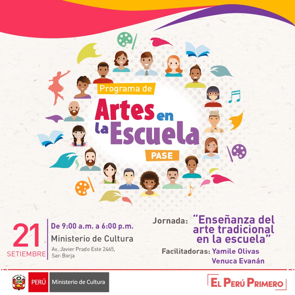 El Ministerio de Cultura, a través de la Dirección de Artes, organiza una nueva jornada de capacitación del Programa de Artes en la Escuela – PASE el día sábado 21 de setiembre de 2019, de 9:00 a.m. a 6:00 p.m. en las instalaciones de la sede central del Ministerio de Cultura (Avenida Javier Prado Este 2465, San Borja).