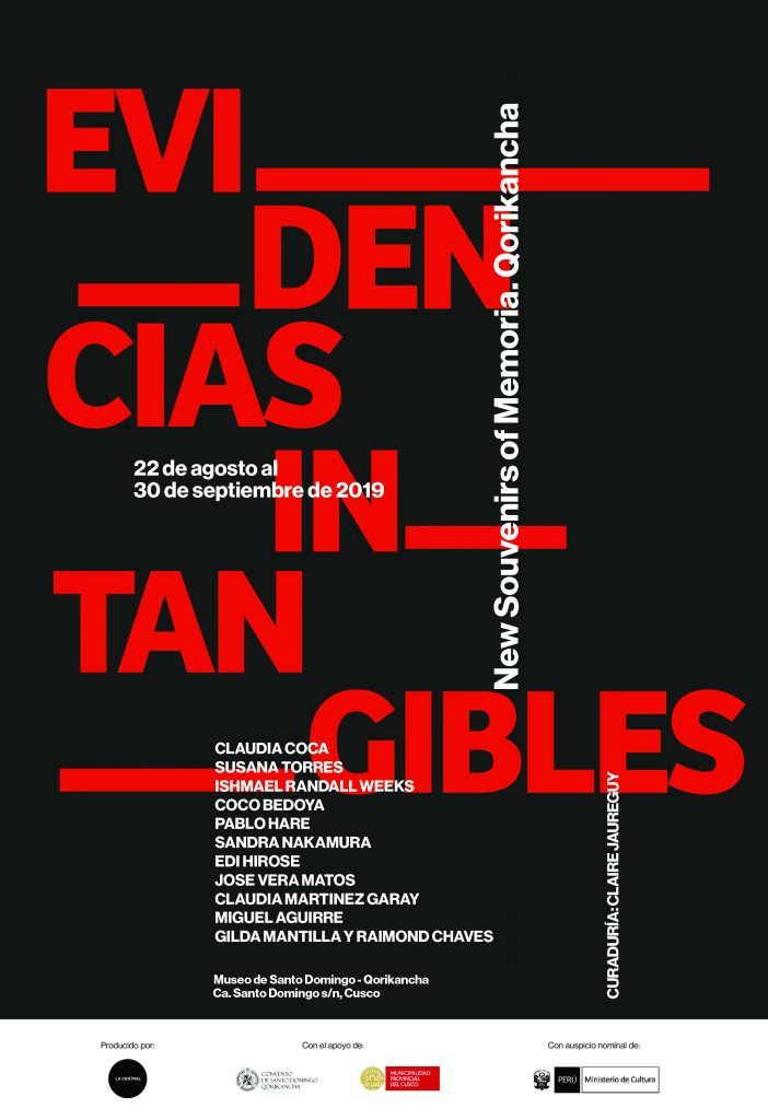 Evidencias intangibles. New souvenirs of memoria. Qorikancha reúne la obra de reconocidos artistas contemporáneos que se apropian de formas de las evidencias para desarrollar las relaciones e interconexiones con problemáticas contemporáneas. El Qorikancha, por su importancia histórica ha sido considerado el espacio más propicio para ser el lugar de exhibición por primera vez de esta muestra colectiva que proponga reflexiones. El medio es el mensaje, en los términos de Mc Luhan, en donde la poética y las paradojas de sentido son más importante incluso que definir cuál es el medio y cuál es el mensaje superponiendo esta idea a una crítica en el terreno de las artes visuales.