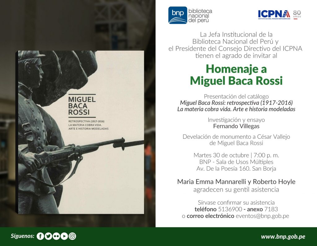 La Biblioteca Nacional del Perú (BNP), con el apoyo del Instituto Cultural Peruano Norteamericano (ICPNA), organizará un homenaje al renombrado escultor chiclayano Miguel Baca Rossi, en conmemoración del centésimo primer aniversario de nacimiento de quien a través de su prolífica y monumental obra escultórica ha dejado una huella indeleble en el arte plástico peruano.