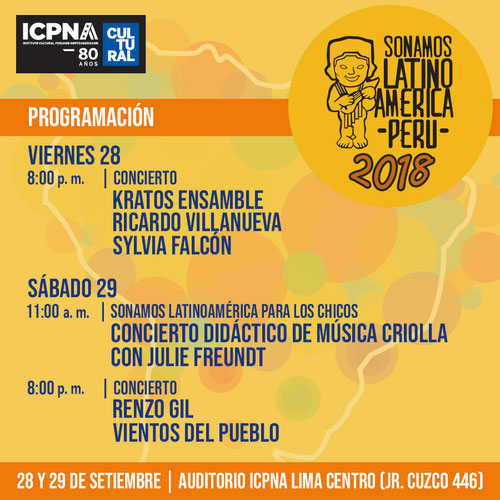 Los artistas que representarán al Perú son Sylvia Falcón, reconocida soprano lírica recordada por la emocionante versión en quechua de nuestro Himno Nacional; el concertista de guitarra y gestor cultural Ricardo Villanueva, el intérprete y productor de música criolla Renzo Gil y la emblemática agrupación de música latinoamericana Vientos del Pueblo. Por su parte, el folklore de Venezuela tendrá como representante a la agrupación Kratos Ensamble.
