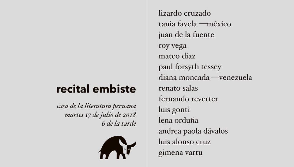 El colectivo de difusión poética La poesía embiste organiza este recital de medio año a realizarse en la Casa de la Literatura Peruana. El recital contará con la participación de reconocidos poetas del medio local: Lizardo Cruzado, Tania Favela, Juan de la Fuente, Roy Vega, Mateo Díaz, Paul Forsyth Tessey, Diana Moncada, Renato Salas, Fernando Reverter, Luis Gonti, Lena Orduña, Andrea Paola Dávalos, Luis Alonso Cruz y Gimena Vartu.