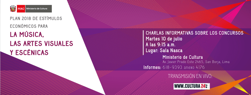 El Ministerio de Cultura realizará dos charlas informativas sobre el proceso de postulación a los Concursos de Estímulos Económicos para las Artes Escénicas, Visuales y la Música 2018. La charla será el martes 10 de julio a las 9:30 am en la Sala Nasca del Ministerio.