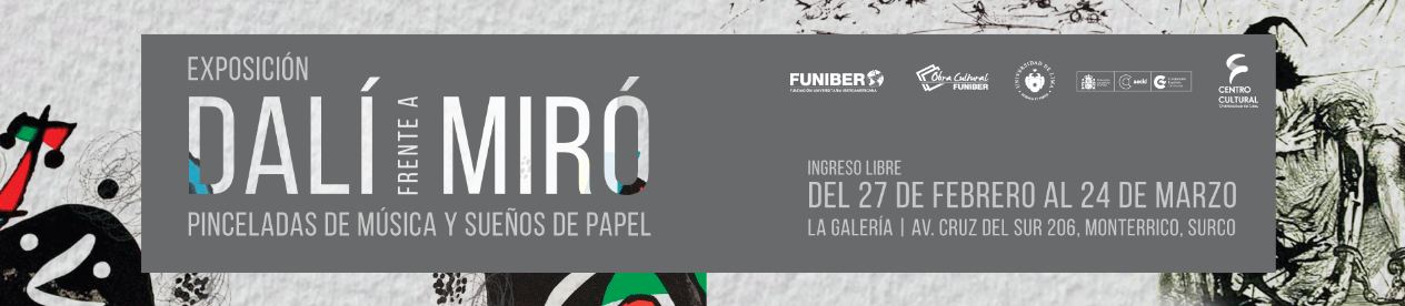El Centro Cultural de la Universidad de Lima presenta la exposición de grabados de Dalí frente a Miró: Pinceladas de música y sueños de papel. Las obras de dos maestros del surrealismo español del Siglo XX, Joan Miró y Salvador Dalí, llegan por primera vez a nuestro país gracias a una iniciativa de la Fundación Universitaria Iberoamericana FUNIBER a través de su programa la Obra Cultural de FUNIBER, con el auspicio de la Embajada de España en Perú.