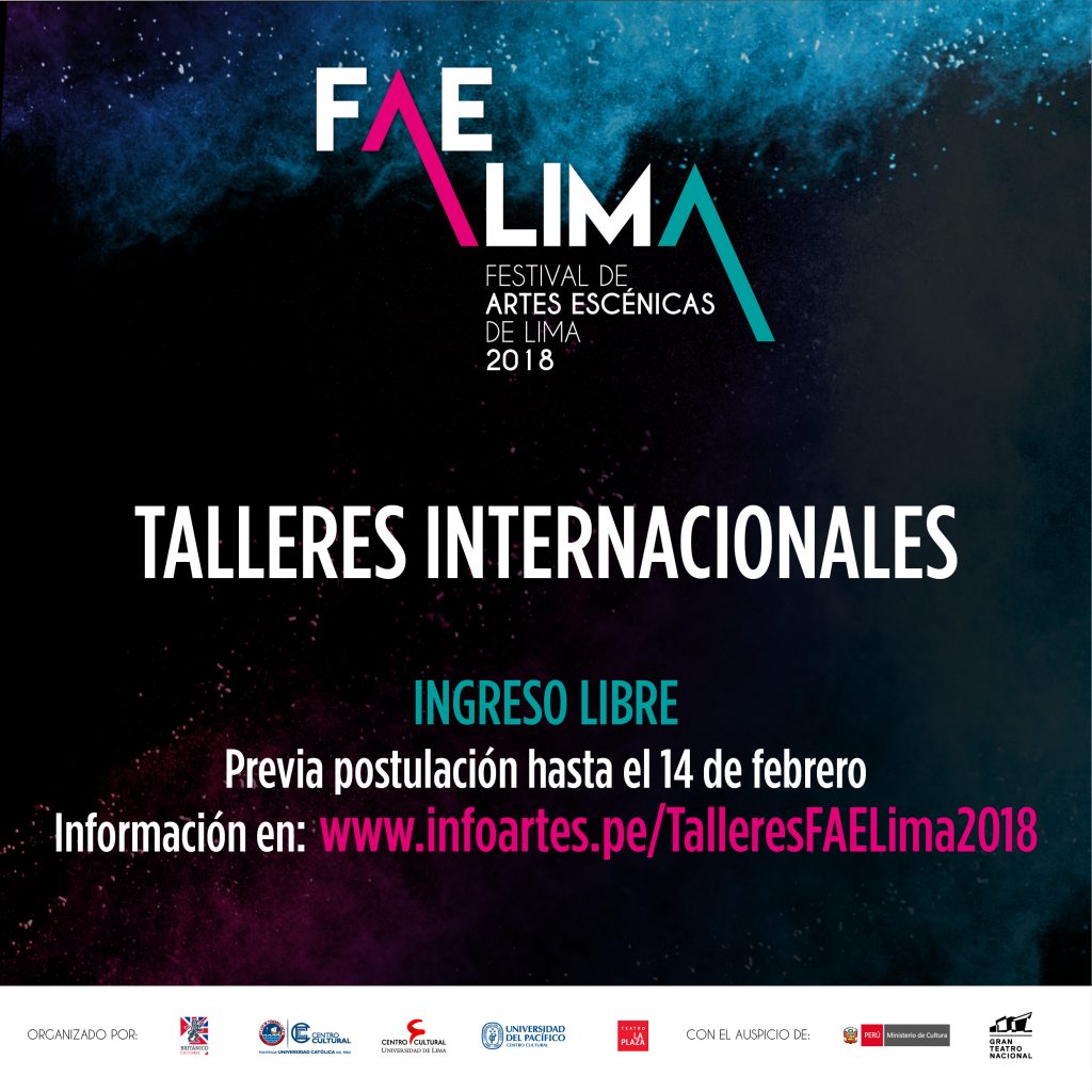 El FAE Lima - Festival de Artes Escénicas de Lima 2018, presenta una serie de talleres especializados de artes escénicas con el fin de promover un espacio de fortalecimiento de capacidades, generar espacios de intercambio entre diversos artistas, y estimular procesos creativos.