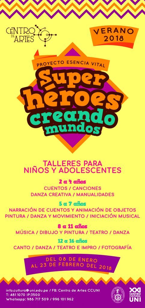 El Centro Cultural UNI anuncia la apertura talleres de verano para el 2018 bajo el lema “Superhéroes creando mundos”, de esta manera el Centro Cultural UNI inicia un novedoso proyecto de educación a través de las artes dirigido a niños y adolescentes, el cual constará de 7 semanas y se dará inicio el lunes 8 de enero.