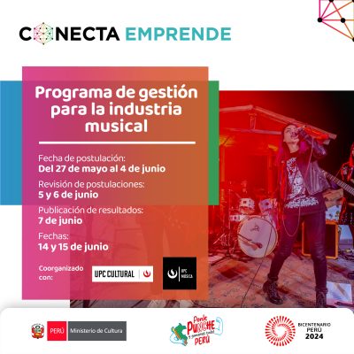 En el marco del Convenio Interinstitucional entre el Ministerio de Cultura y la Universidad Peruana de Ciencias Aplicadas se realiza el Programa de Gestión para la Industria Musical dirigido a toda la comunidad de músicos, agentes culturales y del sector de las artes musicales, con el objetivo de fortalecer las capacidades de gestión del sector musical.