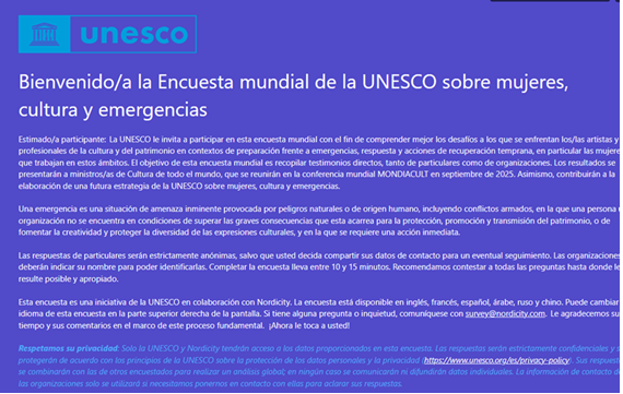 Encuesta Mundial de la Unesco sobre la Mujer, la Cultura y las Emergencias, la cual busca conocer: