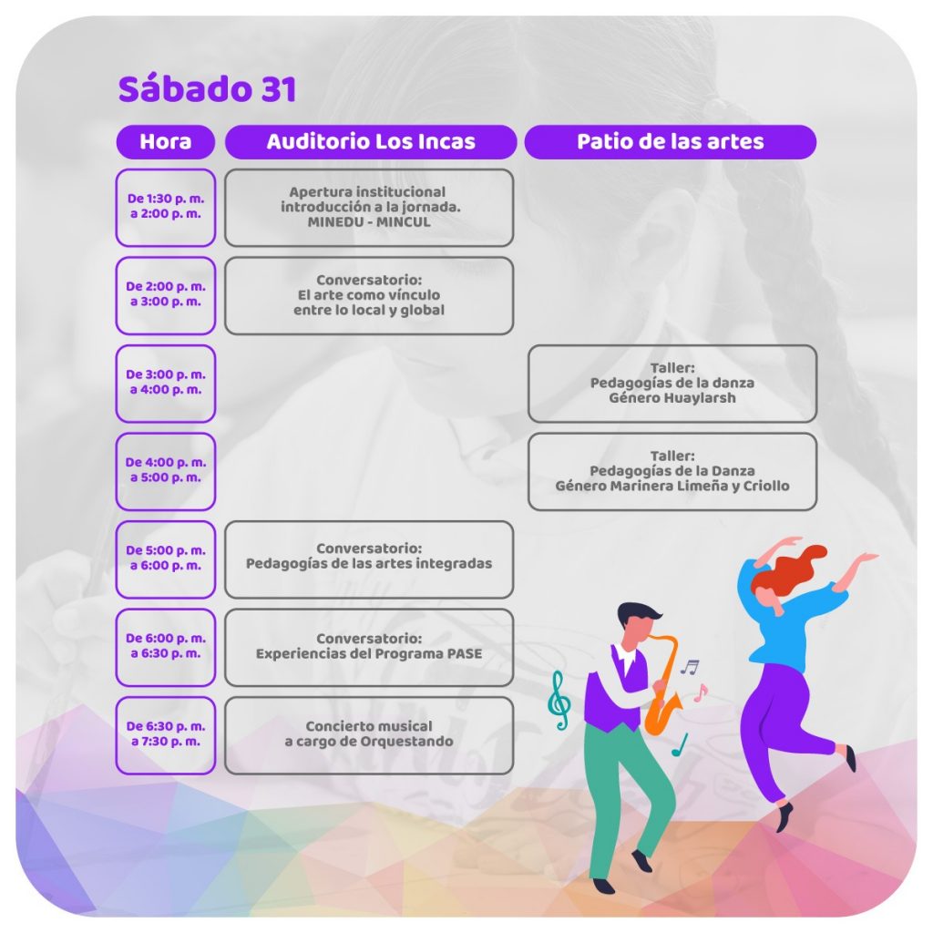 En el marco de la conmemoración internacional de la Semana de la Educación Artística (SEA), promovida por la UNESCO, el Ministerio de Cultura del Perú, en articulación con el Ministerio de Educación, impulsa una jornada especial el día 31 de mayo, concebida como un espacio de encuentro entre la comunidad educativa, artística y cultural. Bajo el lema “El arte y la cultura: vínculos de lo local a lo global”, esta jornada busca poner en valor el potencial transformador del arte y su papel central en la construcción de ciudadanía, inclusión, memoria y diversidad en un contexto de creciente interconnexion cultural.