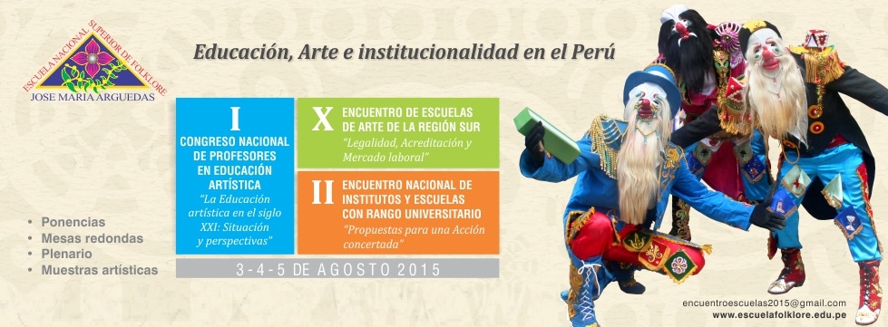 El estudio, desarrollo y difusión del arte y la educación artística son funciones esenciales de las instituciones superiores con rango universitario. Por ello, con el fin de generar espacios de diálogo y reflexión interinstitucional para el desarrollo de la educación en el Perú, la Escuela Nacional Superior de Folklore José María Arguedas organizará: el I Congreso Nacional de Profesores en Educación Artística “La Educación artística en el siglo XXI: Legitimidad y perspectivas”; el X Encuentro de Escuelas de Arte de la Región Sur “Legalidad, Acreditación y Mercado laboral”, así como el II Encuentro Nacional de Institutos y Escuelas con rango universitario “Propuestas legales y Acciones concertadas”, los días 3, 4 y 5 de agosto, respectivamente, en su sede institucional (Jr. Ica 143, Lima).