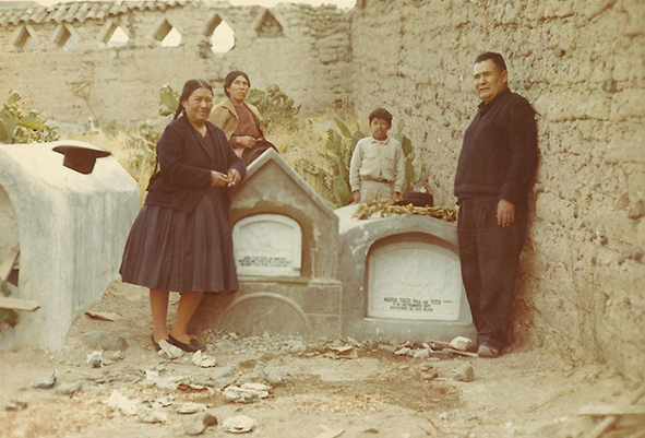 Doña Pascuala y Don Timoteo rinden culto a sus difuntos para demostrar su afecto hacia ellos. La imagen representa la visita a Francisca Quispe (madre de Pascuala), Maria Taco (madre de Timoteo) quién había fallecido hace 6 meses, así como también a sus hijos (Máximo de 6 años, José de 2 años y Bartolomé de 2 meses) cuyos restos descansan debajo de la tumba de la abuela Francisca Quispe.