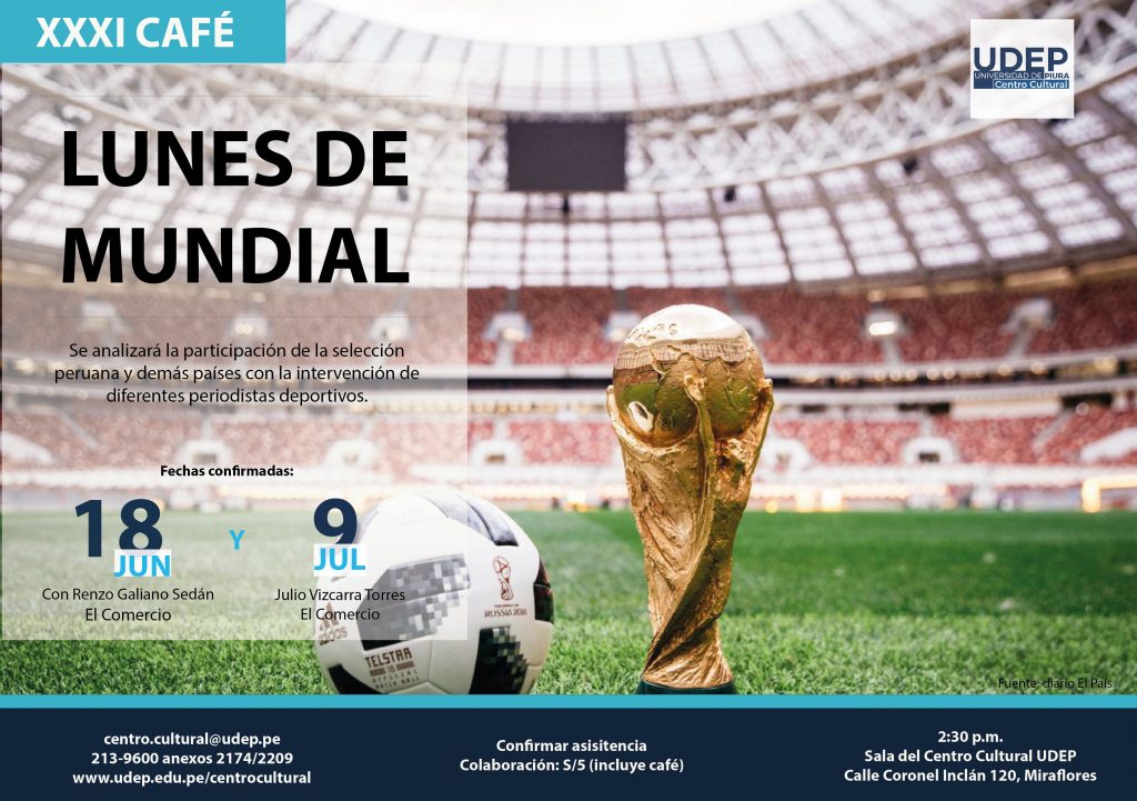 El Centro Cultural de la Universidad de Piura los invita un ciclo de cafés, los días lunes, con la finalidad de analizar la participación de la selección peruana en el mundial de Rusia 2018, a cargo de expertos en el tema.