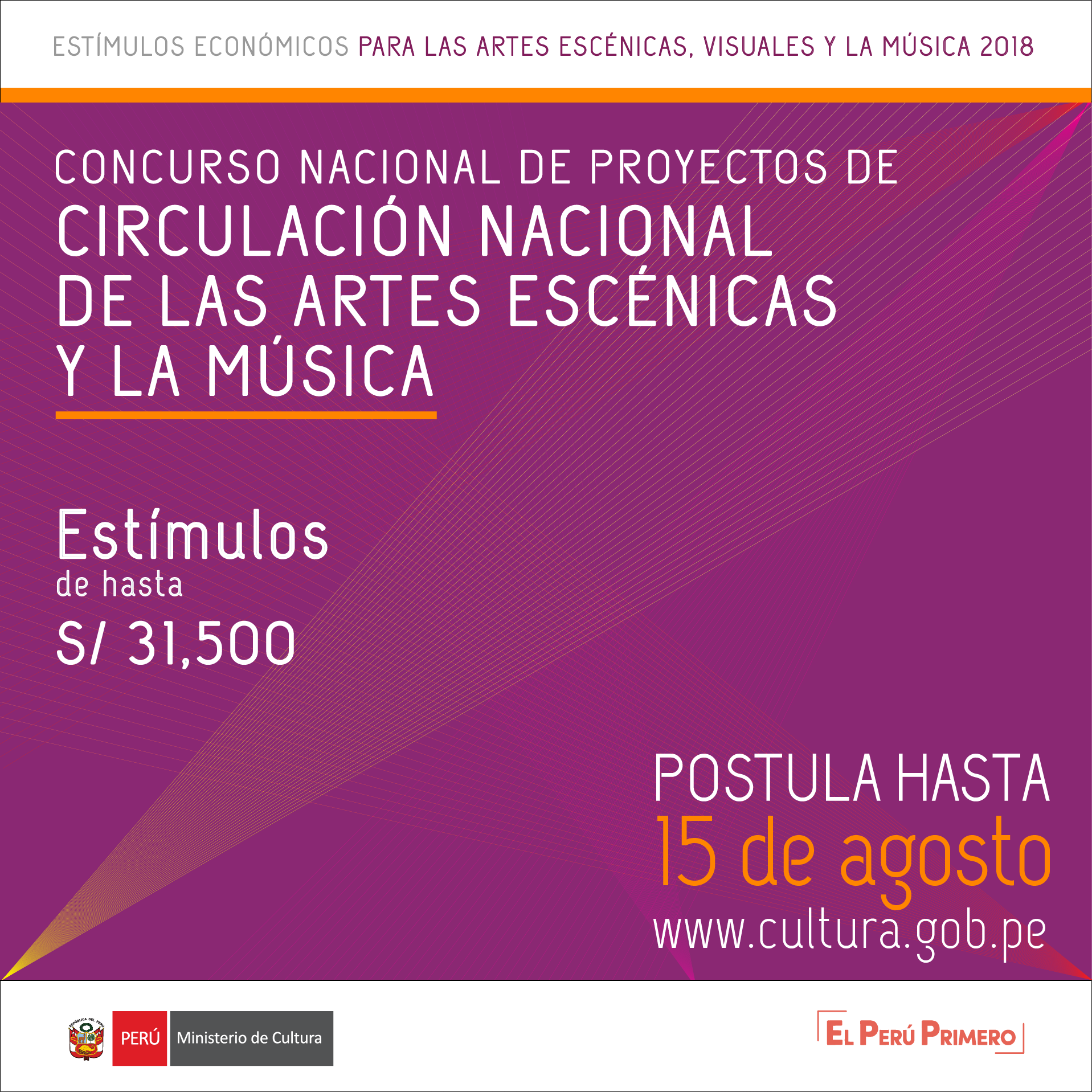 Postulación a través de mesa de partes del Ministerio y sus sedes desconcentradas. Estímulo económico de hasta 35,000 soles. Pueden postular personas jurídicas sin fines de lucro y personas naturales. Fecha límite de postulación hasta el 13 de agosto 2018