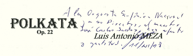 Detalle de la primera página de la Polkata de Luis Antonio Meza, obra estrenada por la OSN con ocasión de su 60° aniversario durante la segunda gestión de Santos como titular del elenco. [Foto: Archivo OSN]