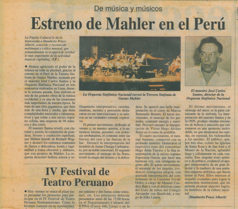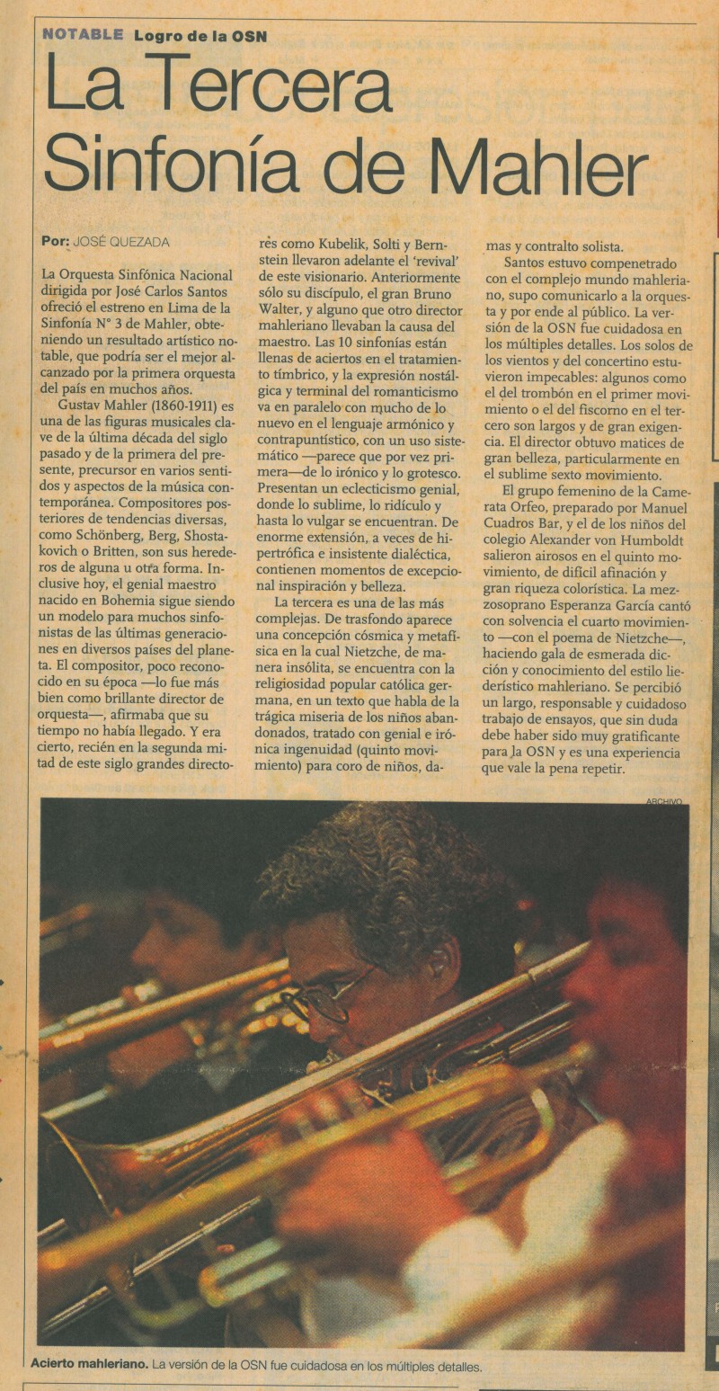 | Mahler, Gustav | Sinfonía Nro. 3 [estr. en Perú] | 20/05/1999 |