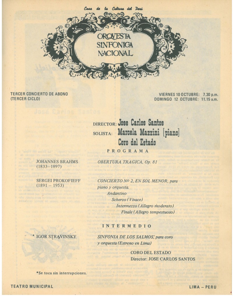 | Stravinsky, Ígor | El beso del hada [estr. en Perú] Sinfonía de los Salmos [estr. en Perú] | 21/09/1973 10/10/1969 |