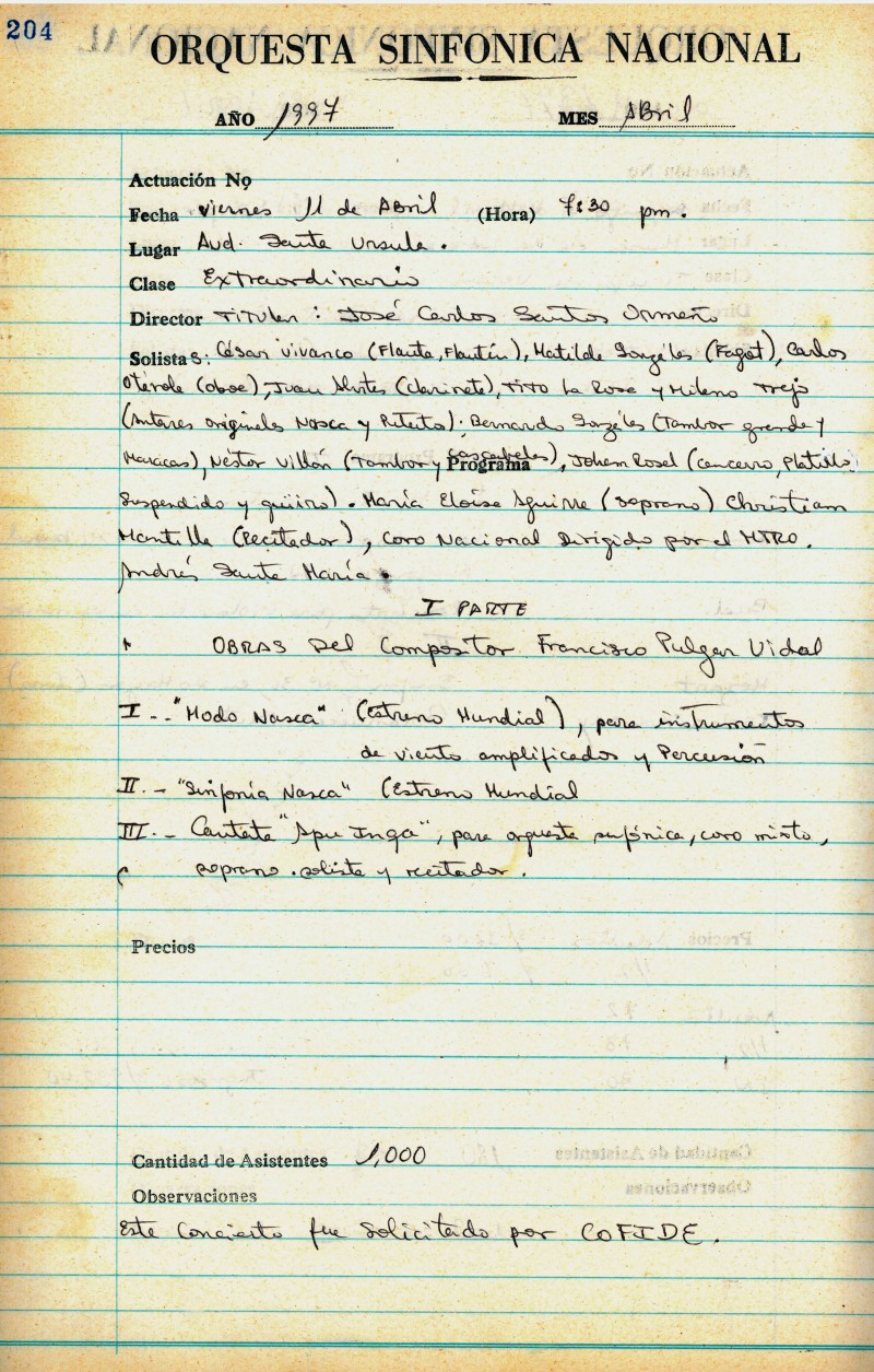 | Pulgar Vidal, Francisco | Concierto para violín Concierto para piano Modo Nasca Sinfonía Nasca | . . 11/04/1997 11/04/1997 |
