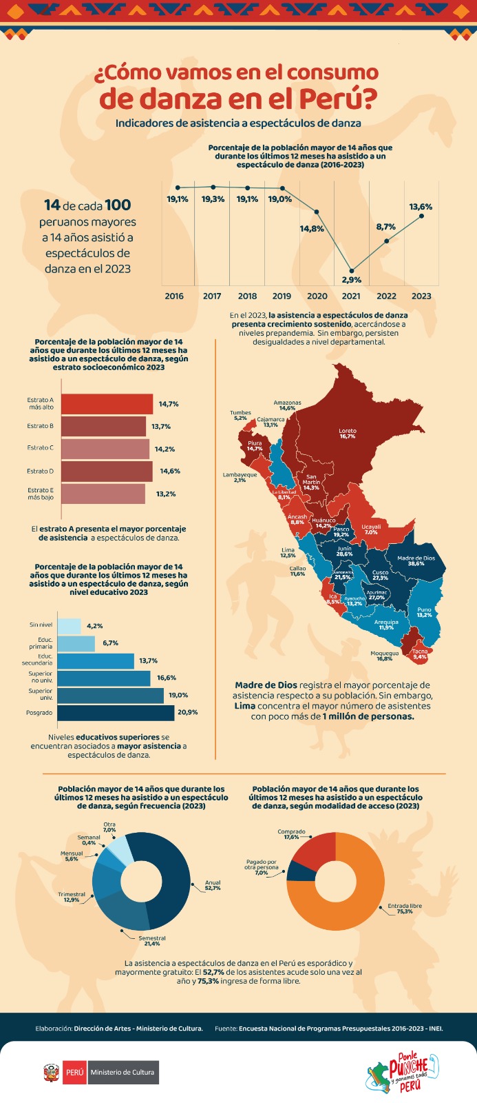 En el marco del Día Mundial de la Danza, la Dirección de Artes del Ministerio de Cultura ha elaborado la infografía con indicadores actualizados sobre los niveles de asistencia a espectáculos de danza en el Perú. La información proviene de la Encuesta Nacional de Programas Presupuestales (ENAPRES) del Instituto Nacional de Estadística e Informática (INEI) que, entre 2016 y 2023, ha recogido los datos representativos sobre los hábitos culturales de la población mayor de 14 años a través del módulo 800A Patrimonio, servicios y bienes culturales. Esta fuente resulta crucial para identificar tendencias, brechas de acceso y dinámicas territoriales en la asistencia a espectáculos de danza, aportando evidencia útil para el diseño de políticas culturales más inclusivas y efectivas.
