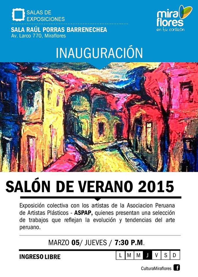 La Asociación Peruana de Artistas Plásticos (ASPAP), fundada el 20 de junio de 1973, afiliada a la Asociación Internacional de Artes Plásticas – AIAP UNESCO , y reconocida oficialmente por el Ministerio de Cultura como entidad cultural, inicia sus actividades anuales con el Salón de Verano 2015, una visión fresca y renovada de la institución más antigua y representativa de la plástica nacional.