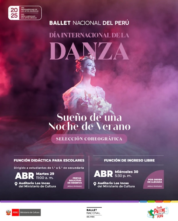En el marco del Calendario de las Artes, la Dirección de Artes, coordina la presentación de dos espectáculos de danza: “Sueño de una noche de verano: Selección coreográfica” en coordinación con la Dirección de Elencos Nacionales (DEN) y “BABELIMA”, Proyecto ganador de los Estímulos Económicos para la Cultura 2024 del Ministerio de Cultura del Perú los días 29 y 30 de abril.
