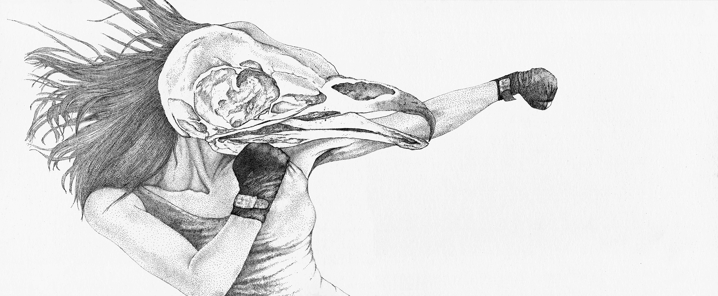 Artista plástica cuyo trabajo parte de apuntes que lleva a manera de diario ilustrado, donde suele registrar muchos de los temas, formas o situaciones que por alguna razón resuenan con ella, al revisarlos, eventualmente encuentra un hilo conductor y es ahí, donde comienza a construir la imagen que va a salir de estos diarios. Las imágenes resultantes terminan siendo la suma de estos varios momentos y  que al unirse cobran un significado diferente. Particularmente para Chamanas  al trabajar con tinta y usando como método el dibujo y como recurso el puntillismo, el proceso le dejó la sensación de estar tejiendo a los personajes que participan en esta exposición.