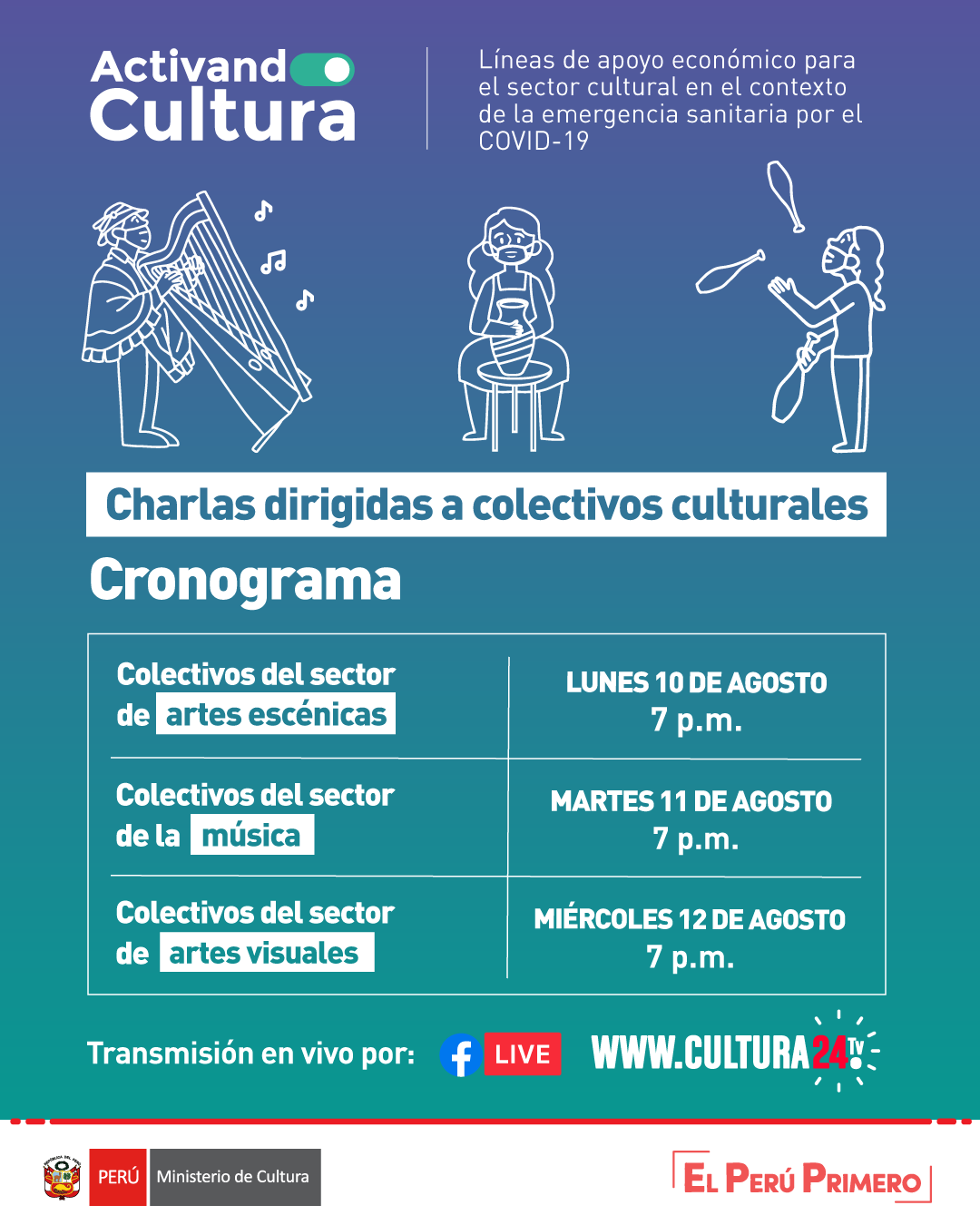 En ese sentido, lo/la invitamos a conectarse a las charlas dirigidas a colectivos de las artes escénicas, visuales y música, que se realizará los días 10, 11 y 12 de agosto (respectivamente) a las 7:00 p.m., a través del canal web Cultura24.tv.