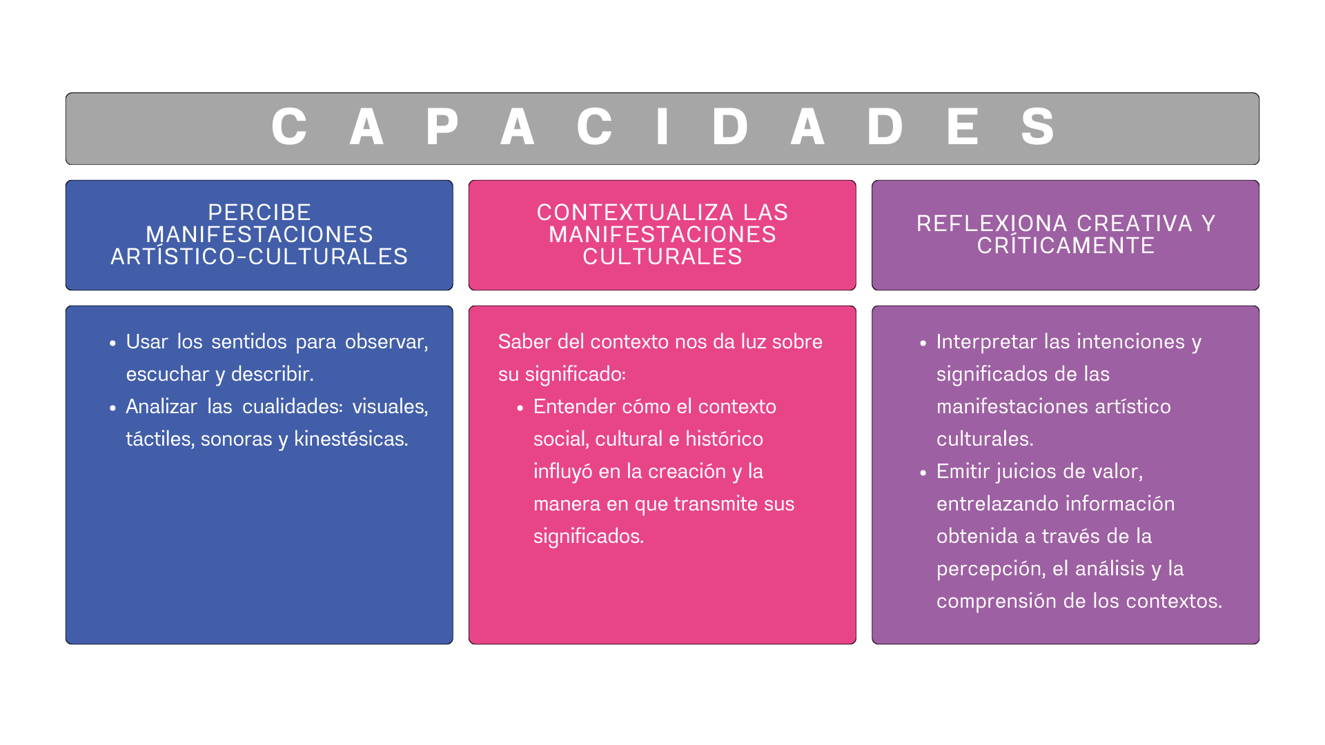 El estudiante usa los diversos lenguajes artísticos (artes visuales, música, danza, teatro, artes interdisciplinares y otros) para expresar o comunicar mensajes, ideas y sentimientos. Pone en práctica habilidades imaginativas, creativas y reflexivas para generar ideas, planificar, concretar propuestas y evaluarlas de manera continua, para lo cual hace uso de recursos y conocimientos que ha desarrollado en su interacción con el entorno, con manifestaciones artístico-culturales diversas y con los diversos lenguajes artísticos. Experimenta, investiga y aplica los diferentes materiales, técnicas y elementos del arte con una intención específica. Así mismo, reflexiona sobre sus procesos y creaciones y los socializa con otros, con el fin de seguir desarrollando sus capacidades críticas y creativas. Esta competencia implica la combinación de las siguientes capacidades: