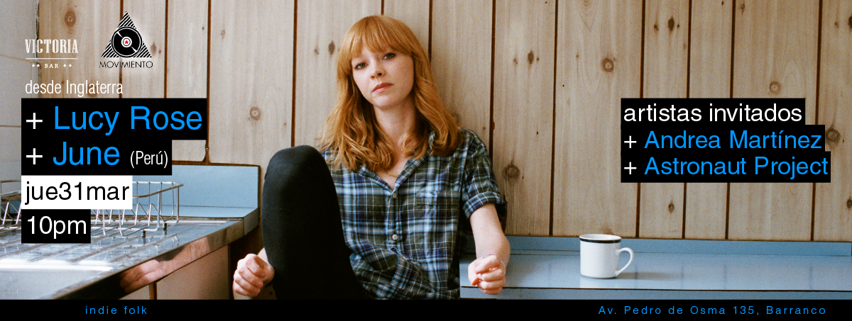 Como un suave y càlido atardecer, llega por primera vez a Lima la cantante inglesa ▲▲ LUCY ROSE ▲▲ una de las màs destacadas figuras del nuevo indie folk britànico de la mano de ▲▲ JUNE ▲▲ (Verónica Grados) quien empieza una nueva carrera como solista, acompañadas por los talentosos artistas locales Andrea Martínez y Astronaut Project. El  evento se realizará este jueves 31 de marzo a las 8:00 pm en VICTORIA BAR y el INGRESO será completamente LIBRE.