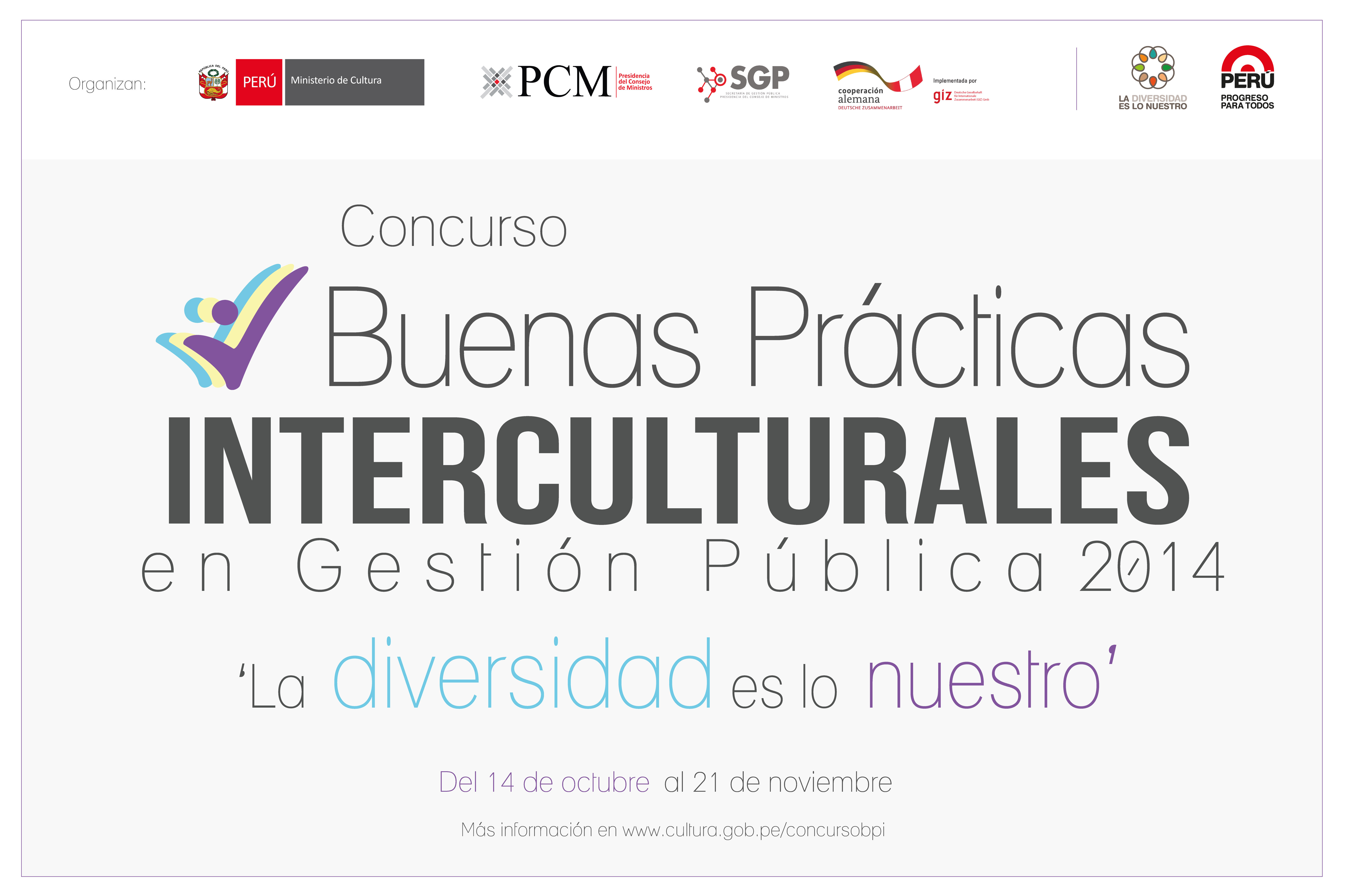 El Ministerio de Cultura, a través del Viceministerio de Interculturalidad; la Secretaría de Gestión Pública de la Presidencia del Consejo de Ministros (PCM) y la Agencia Alemana de Cooperación Técnica (GIZ) convoca a las entidades públicas a nivel nacional a participar en el Concurso 'Buenas Prácticas Interculturales en Gestión Pública 2014: La diversidad es lo nuestro’.