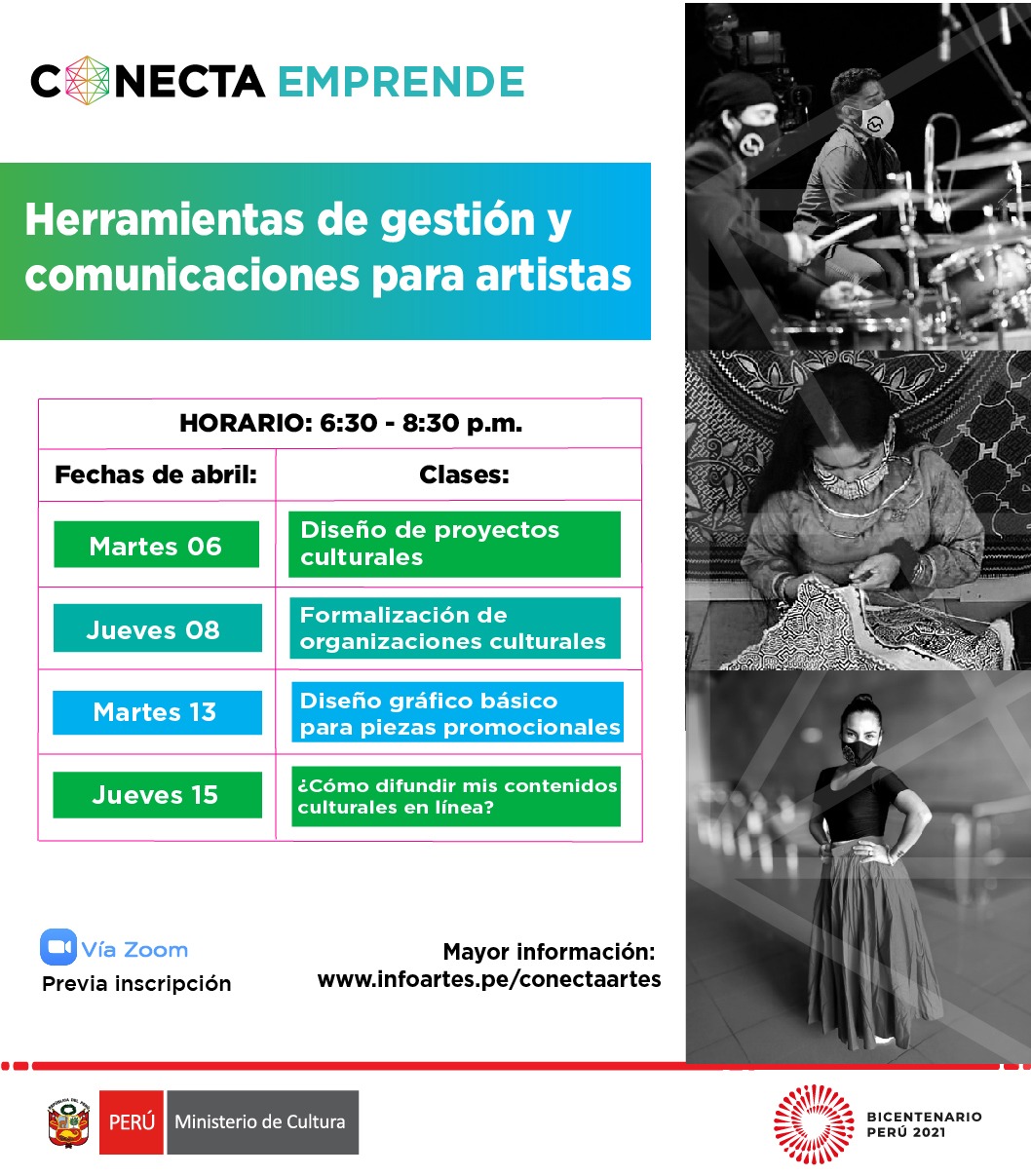 La Dirección de Artes del Ministerio de Cultura, en el marco de la iniciativa CONECTA, pone a disposición 4 clases dirigidas a artistas independientes, colectivos y organizaciones a nivel nacional con conocimientos básicos en los temas propuestos.