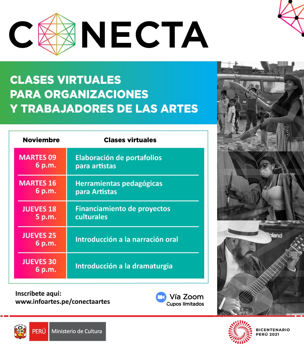 En el mes de noviembre, la Dirección de Artes del Ministerio de Cultura, en el marco de la iniciativa CONECTA, pone a disposición un nuevo ciclo de clases dirigidas a artistas independientes, colectivos y organizaciones a nivel nacional con conocimientos nulos o básicos en los temas propuestos.