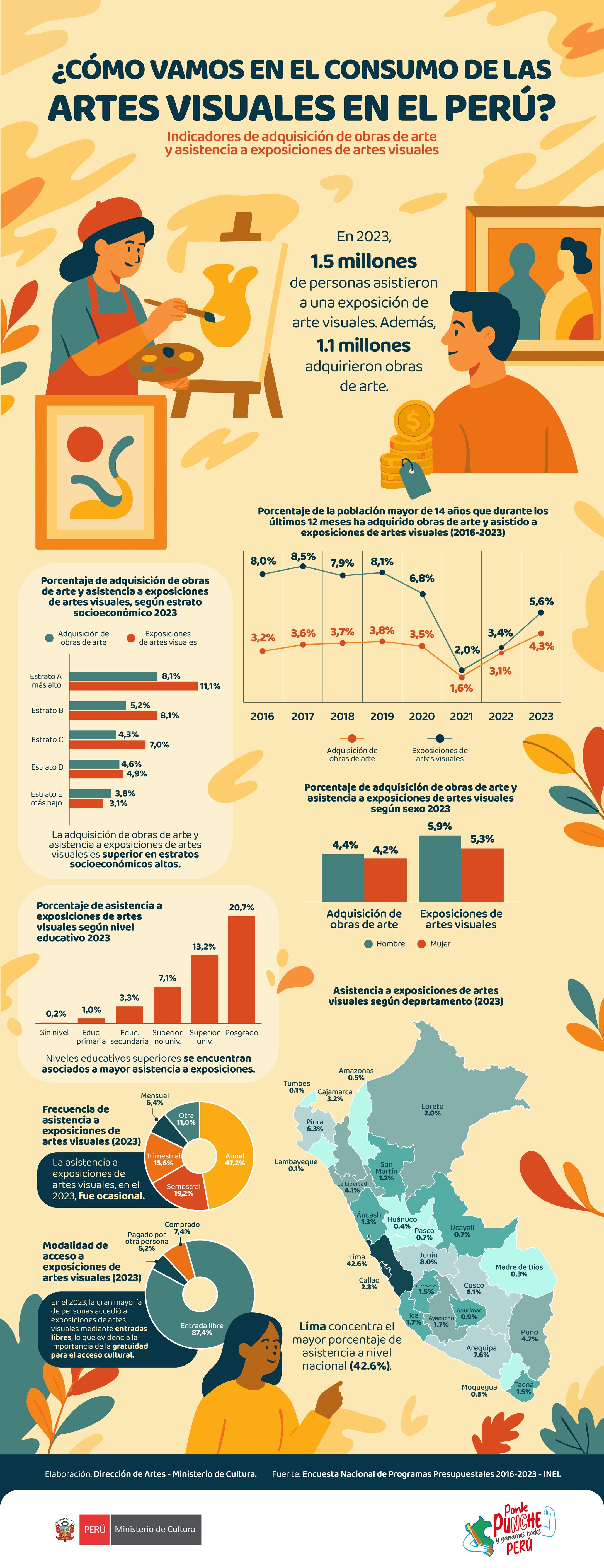En el marco del Día Mundial del Arte, la Dirección de Artes del Ministerio de Cultura ha elaborado la infografía sobre los indicadores actualizados sobre los niveles de asistencia a asistencia a exposiciones de artes visuales y adquisición de obras de arte. La información proviene de la Encuesta Nacional de Programas Presupuestales (ENAPRES) del Instituto Nacional de Estadística e Informática (INEI) que, entre 2016 y 2023, ha recogido los datos representativos sobre los hábitos culturales de la población mayor de 14 años a través del módulo 800A Patrimonio, servicios y bienes culturales. Esta fuente resulta crucial para identificar tendencias, brechas de acceso y dinámicas territoriales en el consumo de artes visuales, aportando evidencia útil para el diseño de políticas culturales más inclusivas y efectivas.