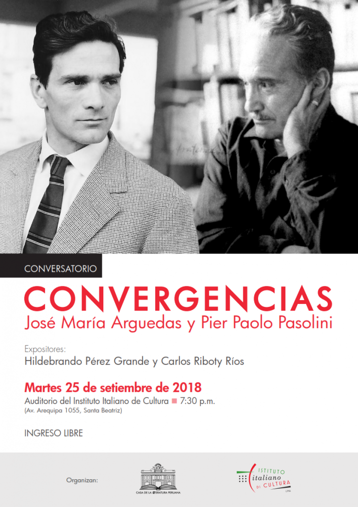El martes 25 de septiembre, a las 7:30 pm., en el auditorio del Instituto Italiano de Cultura (Av. Arequipa 1055, Santa Beatriz), se realizará el conversatorio Convergencias: José María Arguedas y Pier Paolo Pasolini. Esta actividad se realiza en el marco de la alianza académica entre el Instituto Italiano de Cultura y la Casa de la Literatura Peruana. El ingreso será libre.