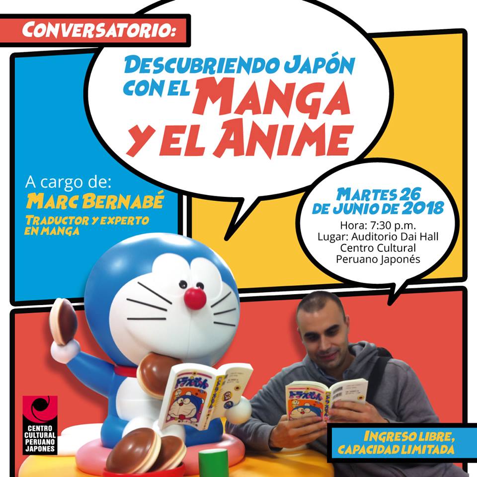 Este martes 26 de junio se llevará a cabo el conversatorio Descubriendo Japón con el manga y el anime, a cargo de Marc Bernabé en el Centro Cultural Peruano Japonés,  Av. Gregorio Escobedo 803, Jesús María.