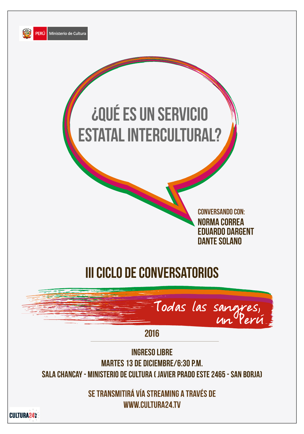 El día martes 13 de diciembre a las 6.30 pm tendrá lugar el conversatorio “¿Qué es un servicio estatal intercultural?”, en donde se discutirá qué criterios debe satisfacer un servicio estatal intercultural y qué lecciones podemos extraer de experiencias internacionales existentes. El evento tendrá lugar en el Ministerio de Cultura y contará con la presencia de Norma Correa, Eduardo Dargent y Dante Solano.