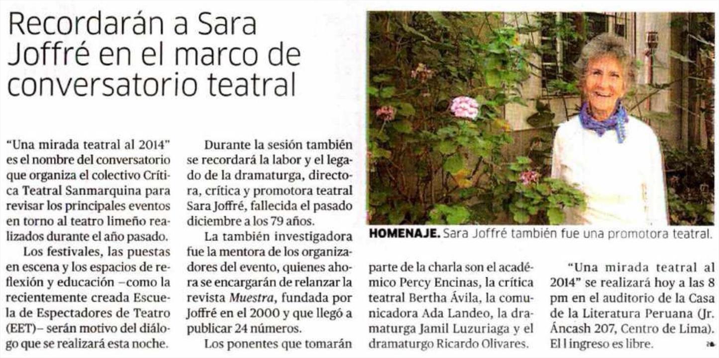 “Una mirada teatral al 2014” es el nombre del conversatorio que organiza el colectivo Crítica Teatral Sanmarquina para revisar los principales eventos en torno al teatro limeño realizados durante el año pasado. Los festivales, las puestas en escena y los espacios de reflexión y educación —como la recientemente creada Escuela de Espectadores de Teatro (EET)— serán motivo del diálogo que se realizará esta noche en la Casa de la Literatura a las 8pm.