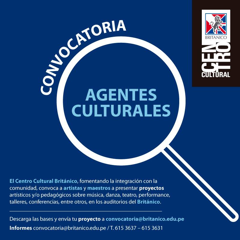 El Centro Cultural Británico lanza convocatoria "Agentes Culturales" invitando a todos los artistas, directores y gestores culturales, de las distintas manifestaciones culturales y disciplinas artísticas, a enviar una muestra de sus proyectos a fin de participar en el proceso de selección de la programación 2016 de los auditorios del Centro Cultural Británico.