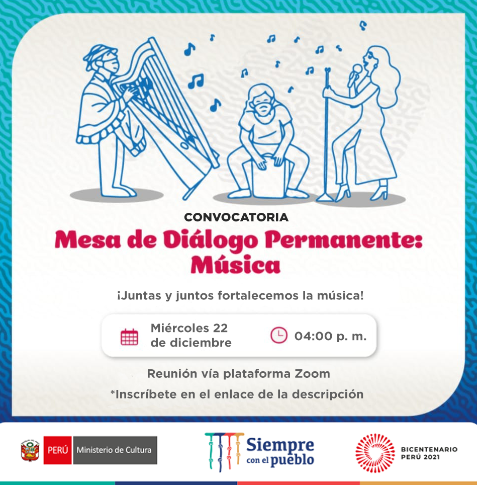 La Dirección de Artes, órgano de línea de la Dirección General de Industrias Culturales y Artes del Ministerio de Cultura del Perú, convoca a redes y plataformas de música a participar de la Mesa de Diálogo Permanente que se llevará acabo el miércoles 22 de diciembre del 2021 a las 4:00 p.m. vía plataforma Zoom.