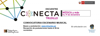 El 8 y 9 de diciembre en la ciudad de Trujillo se realizará el Encuentro CONECTA Música y más. La organización y programación general está a cargo de la Dirección General de Industrias Culturales y Artes del Ministerio de Cultura, y contará con espacios de formación para todos los sectores de las industrias culturales y actividades enfocadas al sector de la música en específico.