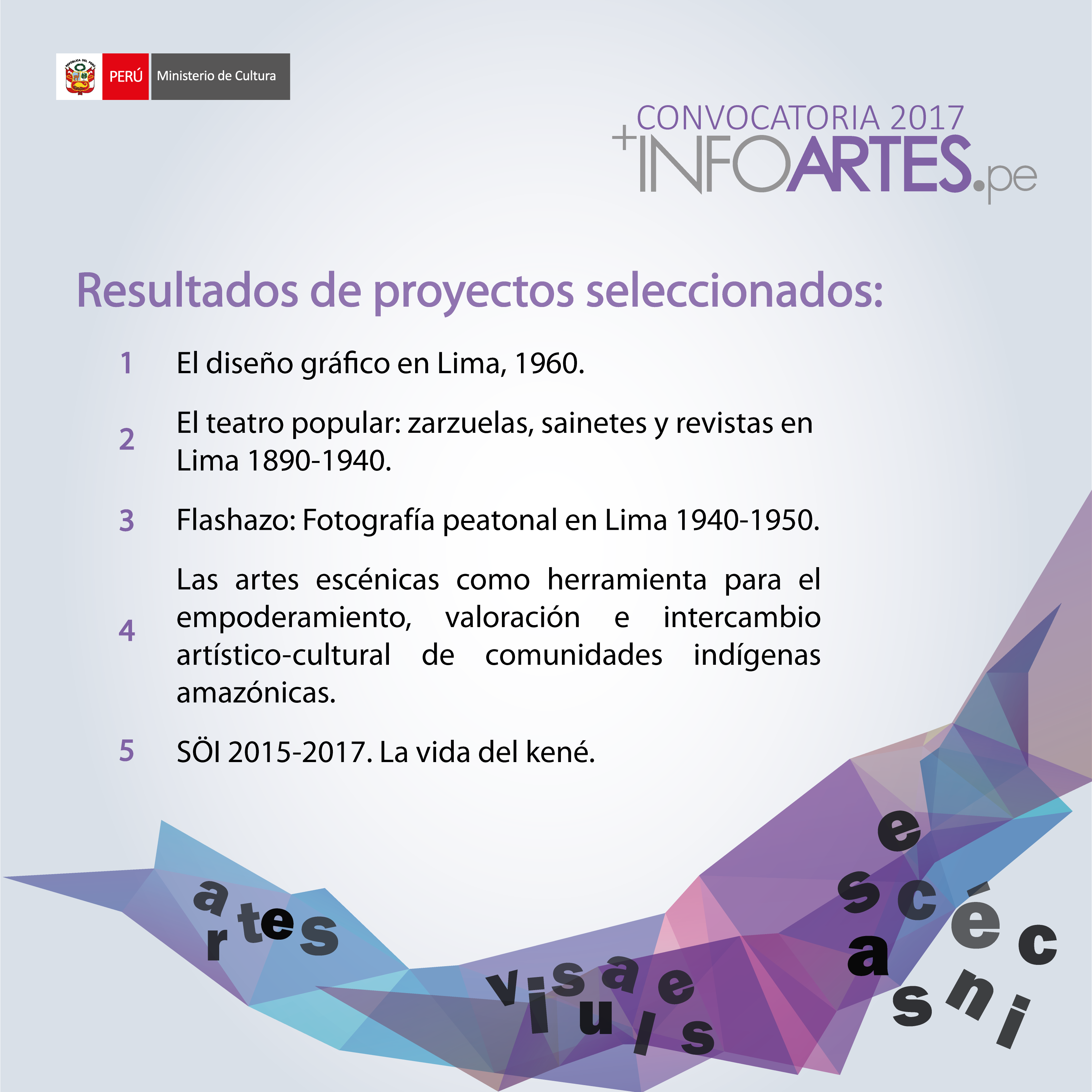 El Ministerio de Cultura se complace en anunciar los nombres de los proyectos de gestión de información y conocimiento en artes escénicas y visuales seleccionados en la Convocatoria INFOARTES 2017.