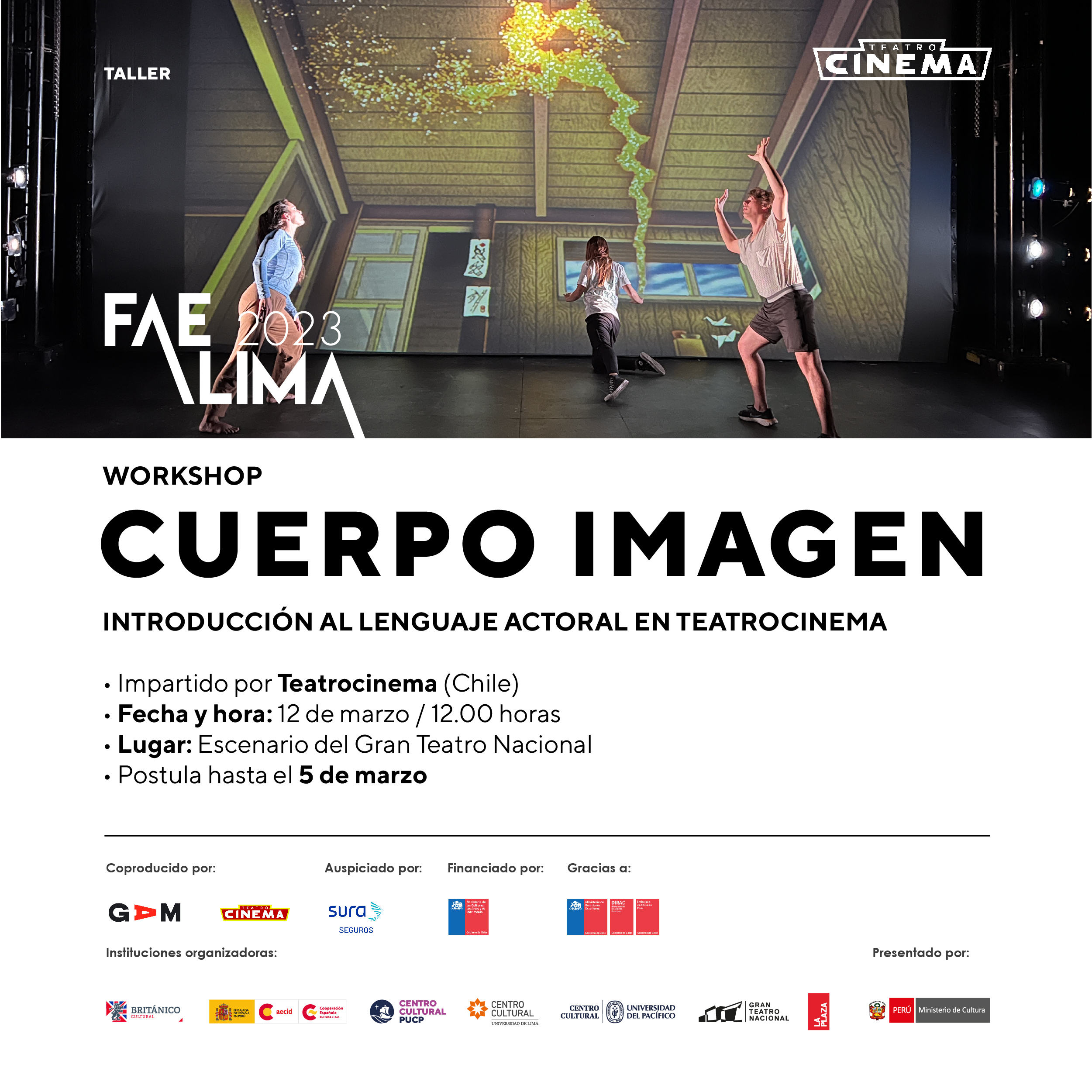 El Festival de Artes Escénicas de Lima 2023, presentado por el Ministerio de Cultura del Perú, lanza la convocatoria para el taller presencial WORKSHOP CUERPO IMAGEN. Introducción al lenguaje actoral en Teatrocinema.