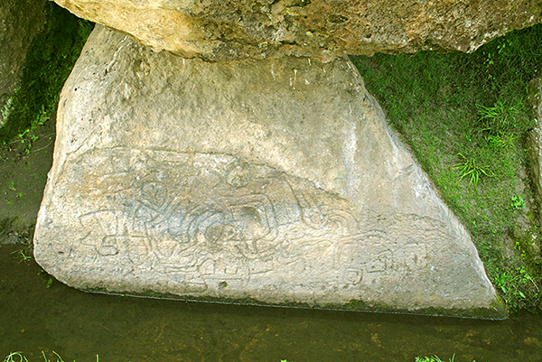 La foto N°4 de título "Petroglifo de Cumbemayo", estos petroglifos se encuentran en el camino del acueducto o canal de agua, se cuenta que Julio C. Tello estuvo estudiando la iconografía y lo que representaban en las culturas antiguas