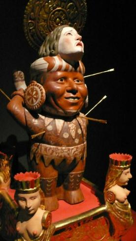 “De las quince imágenes, he extraído la identidad precolombina que existe en ellas. Por ejemplo, Santiago es aquí una entidad Tiahuanaco. No estoy tratando ser fiel al autor, es simplemente una entidad que toma el cuerpo de un Tiahuanaco. También está San Sebastián, aquí el rostro del santo es de sufrimiento, mientras que el otro personaje está feliz de la vida porque a pesar de tanto tiempo todavía está vivo”.