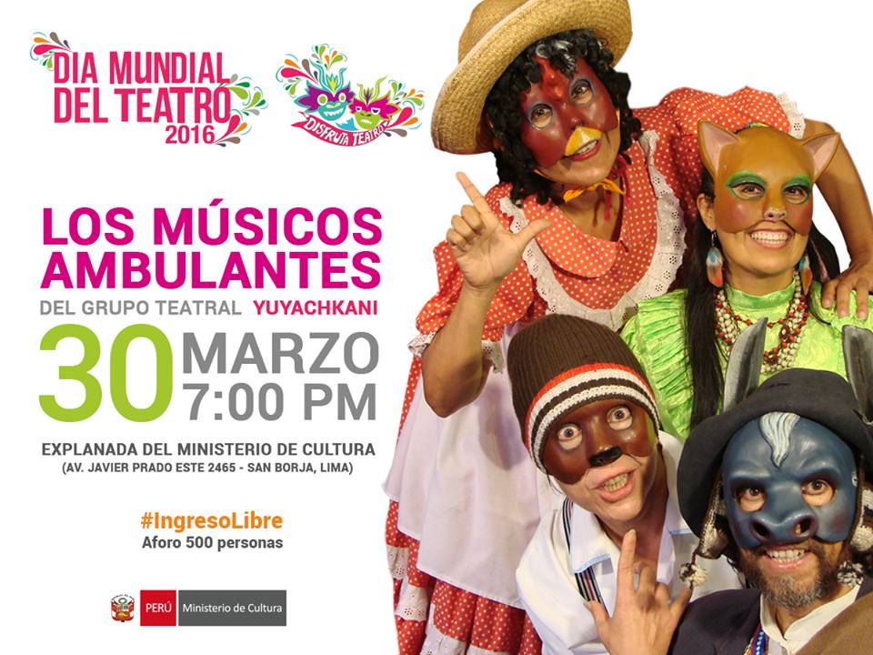 EL MINISTERIO DE CULTURA CELEBRA EL DÍA MUNDIAL DEL TEATRO 2016. Se realizarán presentaciones gratuitas a nivel nacional, reconocimientos a personalidades del teatro, ciclo de conversatorios y capacitaciones en artes escénicas, entre una extensa variedad de actividades para celebrar juntos el Día Mundial del Teatro. Revisa y participa en las actividades que se realizarán del 21 marzo al 3 de abril.