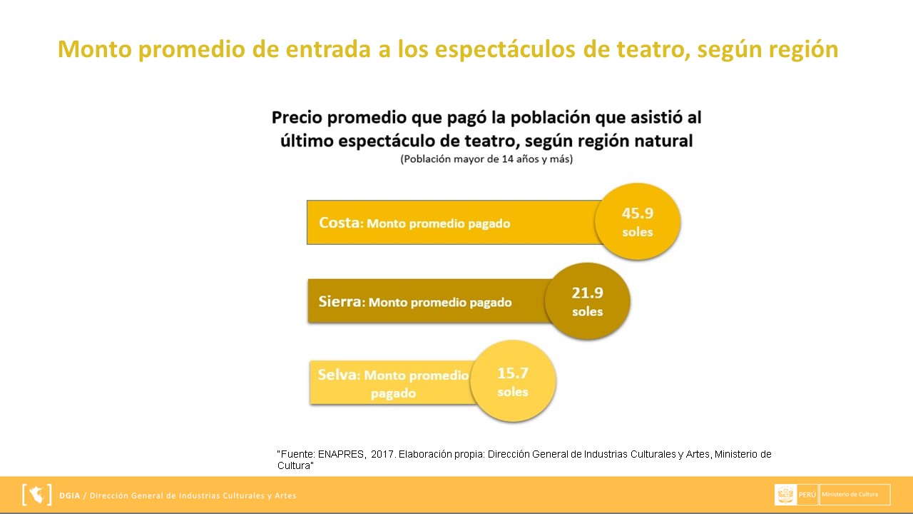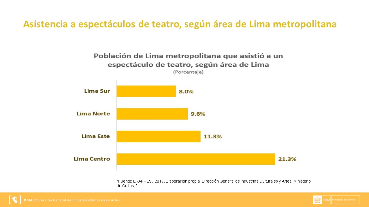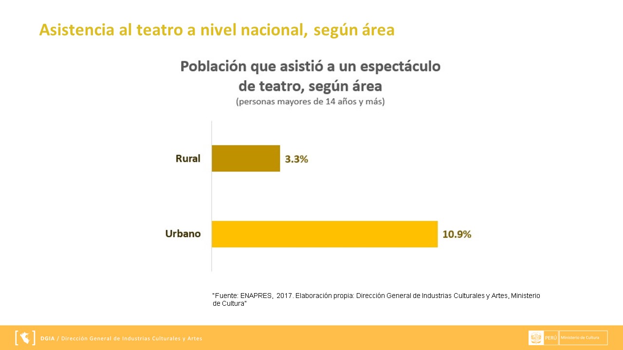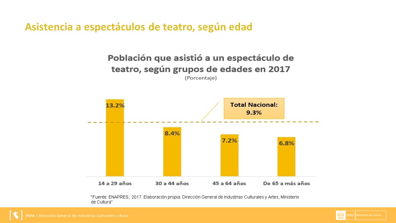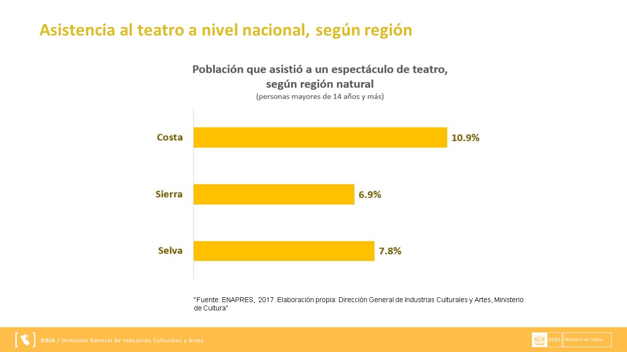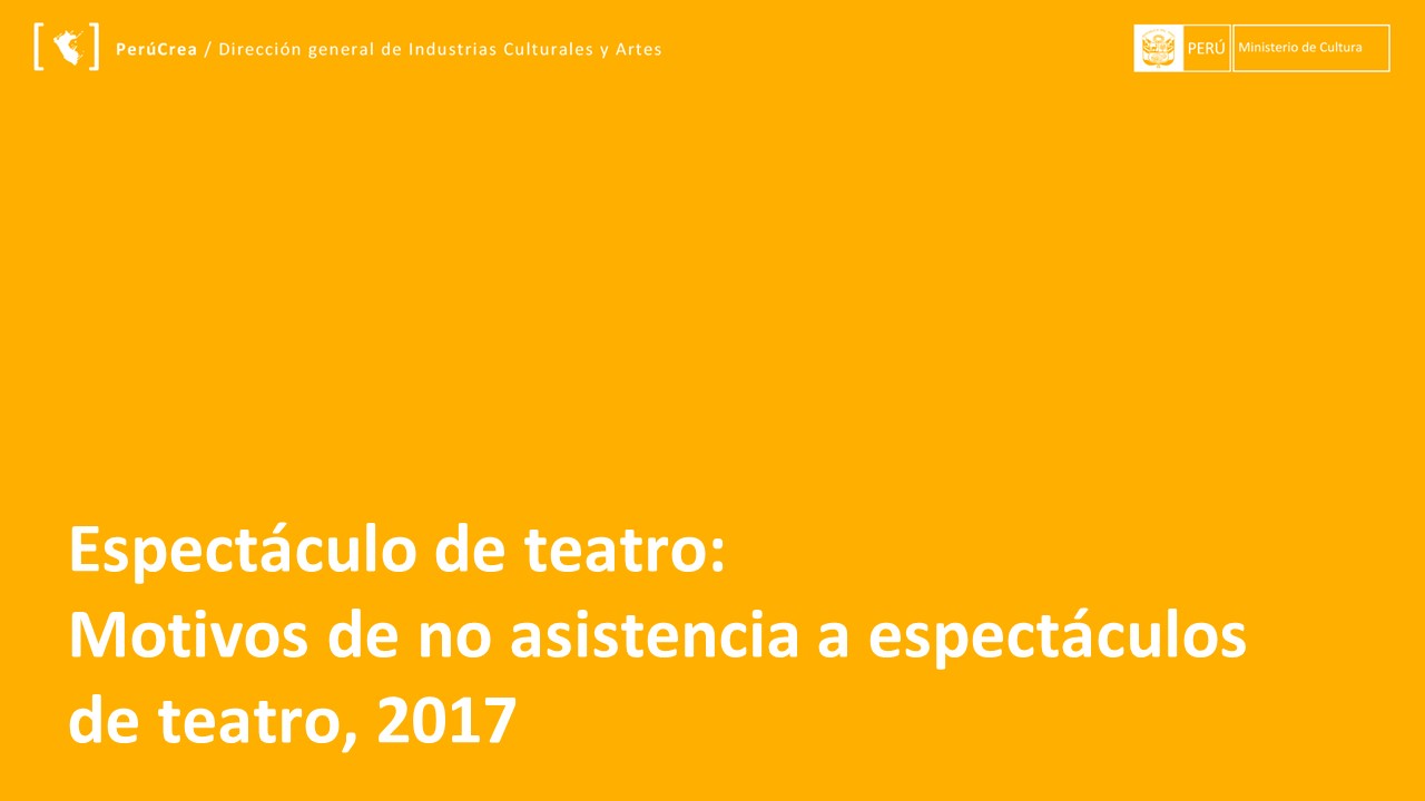 Presentamos la información respecto al Estado del consumo de las artes escénicas en el Perú, 2017-Teatro, la cual se expuso en la Segunda Mesa de Industrias Culturales a cargo de la Dirección General de Industrias Culturales y Artes (DGIA) en noviembre del 2018.