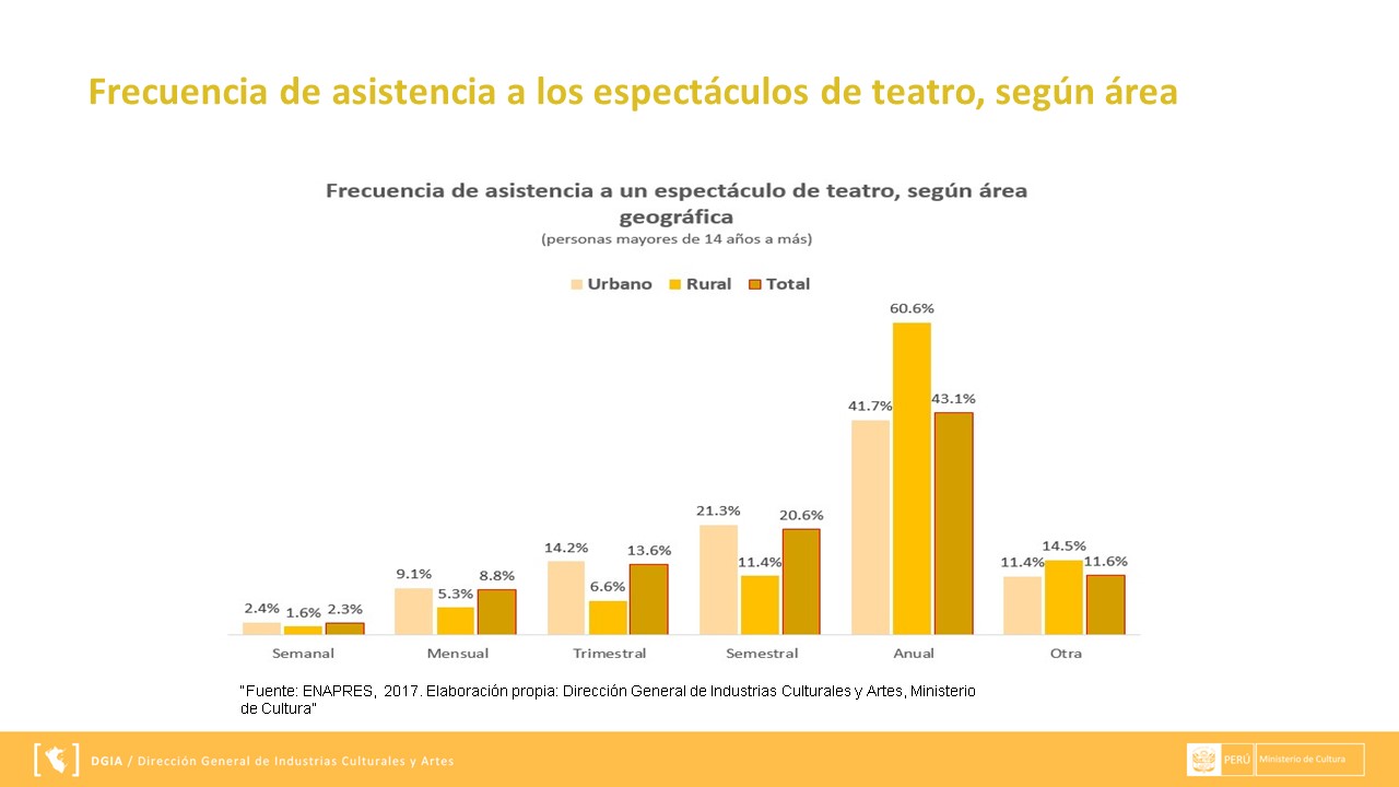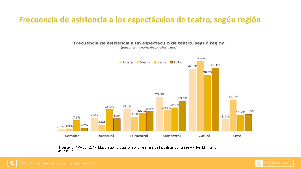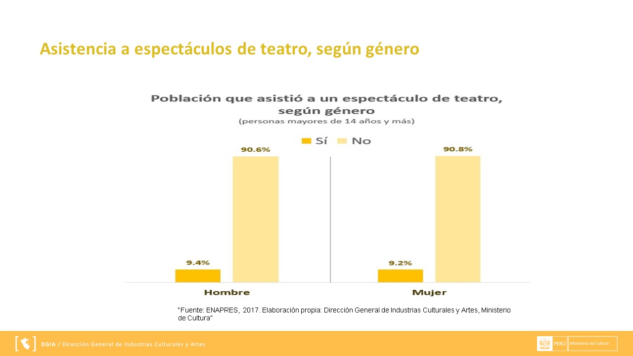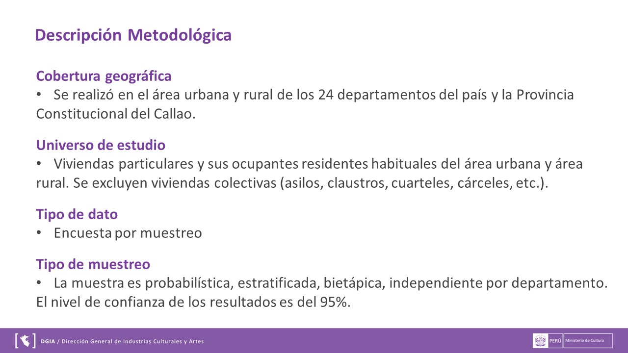 La información presentada se extrae a través de ENAPRES (Encuesta Nacional de Programas Estratégicos) y los reportes que se muestran a continuación han sido preparados por el área de Gestión de Información de la Dirección General de Industrias Culturales y Artes. Puedes descargarla en el siguiente enlace DMT.