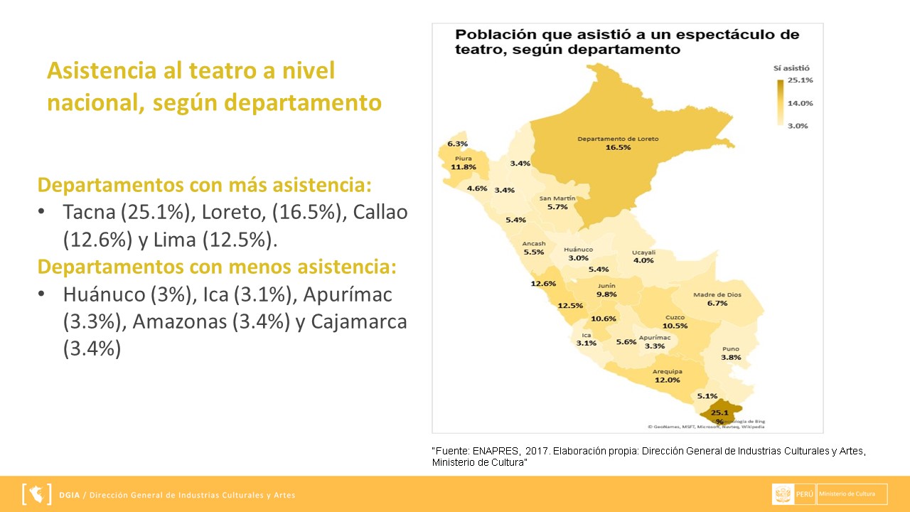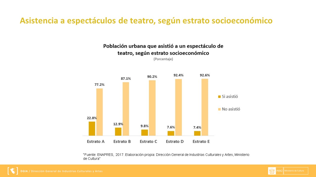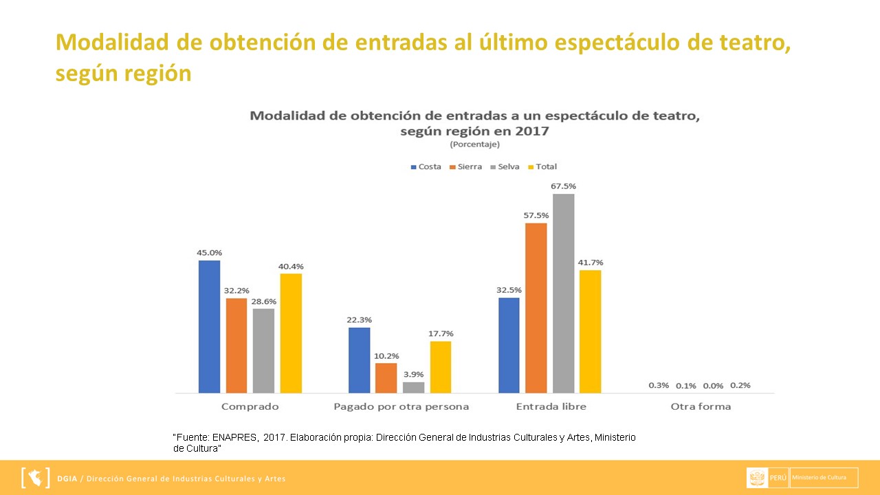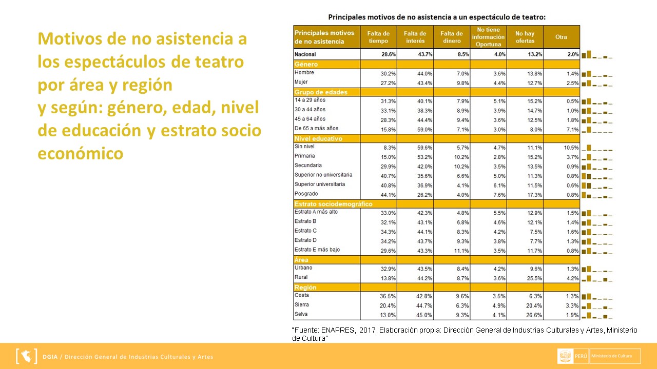 La información presentada se extrae a través de ENAPRES (Encuesta Nacional de Programas Estratégicos) y los reportes que se muestran a continuación han sido preparados por el área de Gestión de Información de la Dirección General de Industrias Culturales y Artes. Puedes descargarla en el siguiente enlace DMT.
