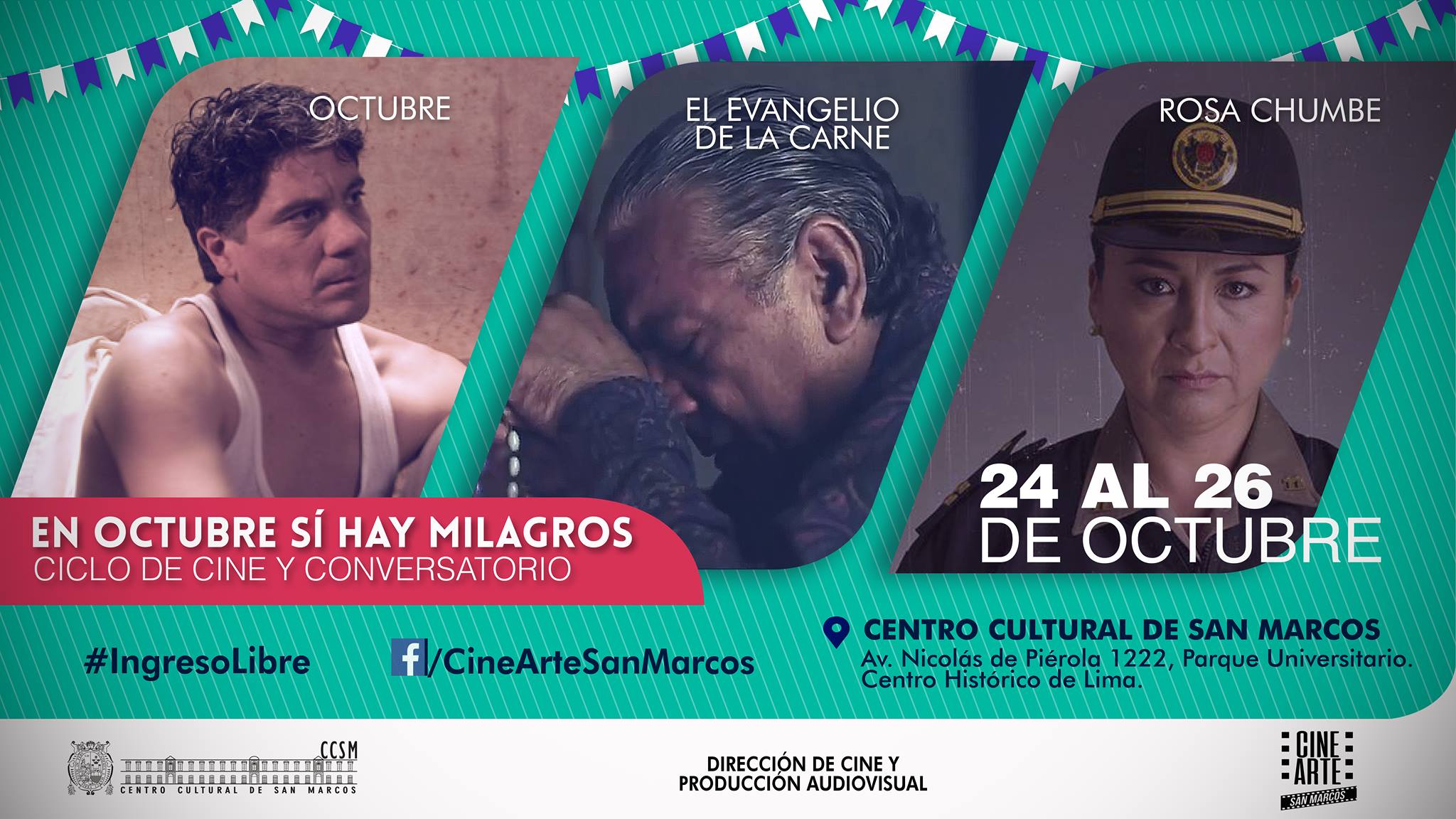 ¡Cine en el Mes Morado! Les presentamos En octubre sí hay milagros, ciclo de películas que organiza la Dirección de Cine y Producción Audiovisual de la UNMSM los días 24, 25 y 26 de este mes a las 6:00 p.m. Se realizará en el Centro Cultural de San Marcos, Av. Nicolás de Piérola 1222, Parque Universitario, Centro Histórico de Lima. El ingreso a todas las funciones es libre.