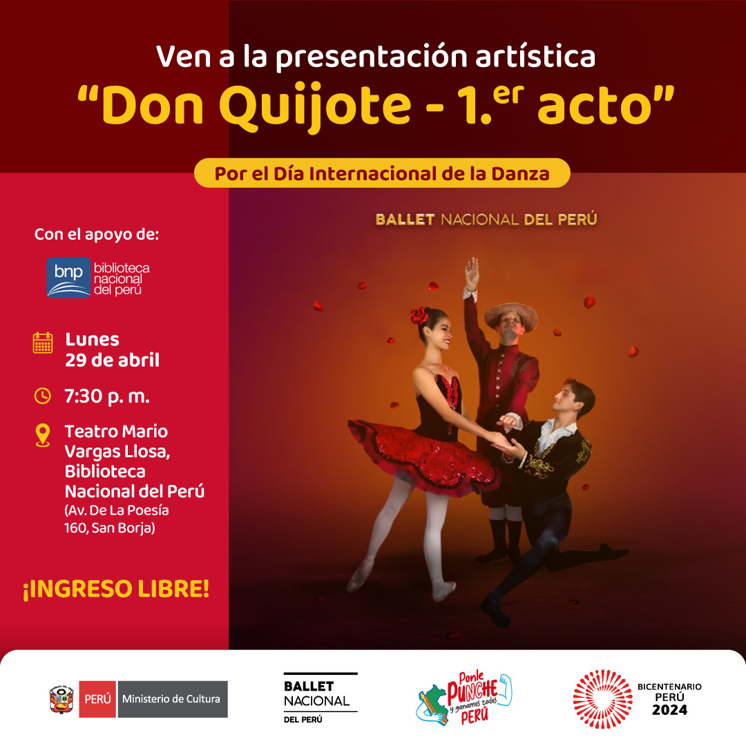 Se presentará el primer Acto "Don Quijote", a cargo del Ballet Nacional del Perú, bajo la dirección de la maestra Grace Cobián en el Teatro “Mario Vargas Llosa” de la Biblioteca Nacional del Perú (BNP) a las 7:30 p.m. El ingreso es libre y por orden de llegada.