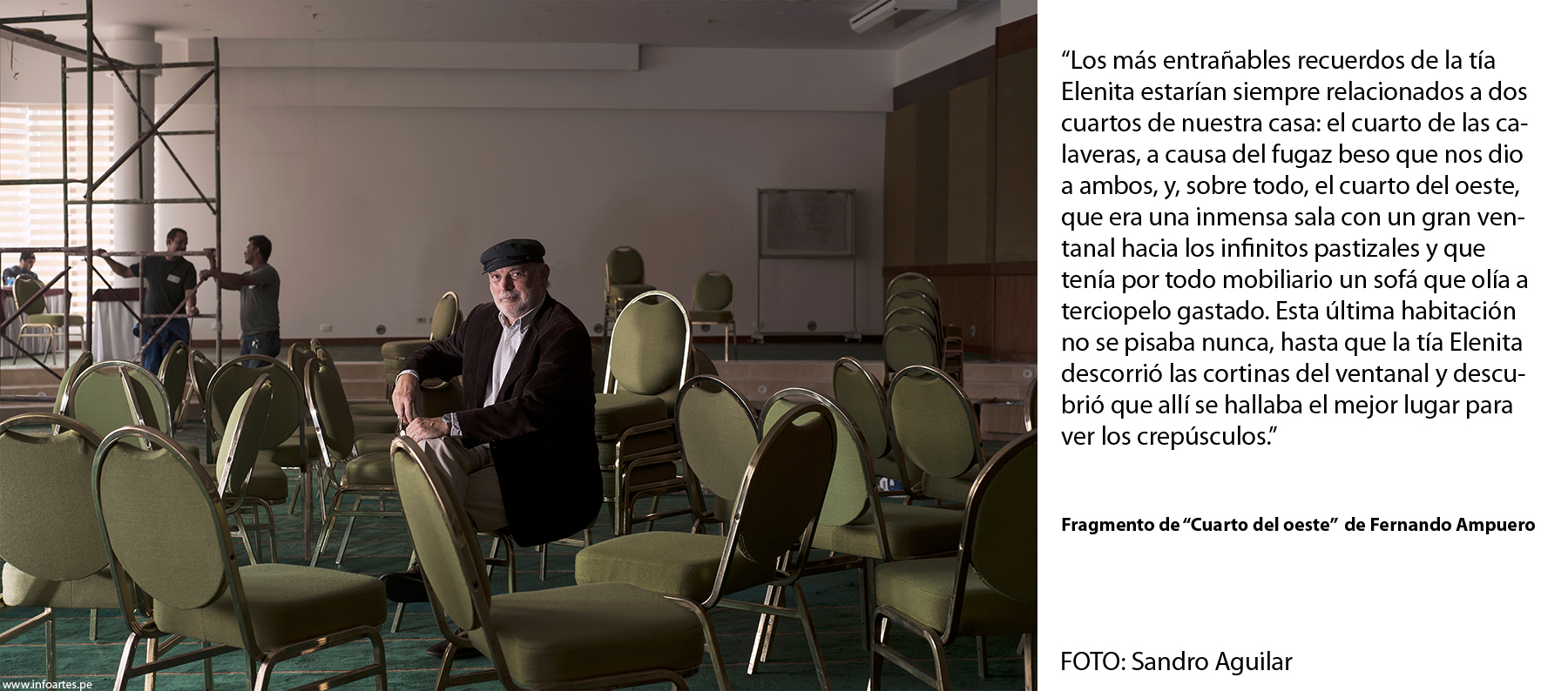 Esta serie de retratos fue iniciada en la Feria Internacional del Libro de Bogotá 2014 por encargo del Ministerio de Cultura, con el objetivo de crear un archivo fotográfico de escritores peruanos que documente su participación colectiva ante diversos públicos y, posteriormente, que el uso de este acervo fomente la aproximación de más lectores a sus obras. La dirección fotográfica se planteó por medio de una pauta escénica con los propios autores, en la que se dispusieron los elementos y circunstancias presentes en sus obras, cuando no un reflejo biográfico. La amplitud del espacio fotografiado propone el aislamiento del escritor -referencia del ejercicio literario también-, donde el vacío se profundiza y se transforma en contenido. Desde esta premisa, se descartó la idea del retrato convencional con el rostro ocupando el encuadre, para abrir paso a la ubicación desde donde surge la trama, como la acción de una película que es llevada por los contrapuntos del drama, el humor y el suspenso.